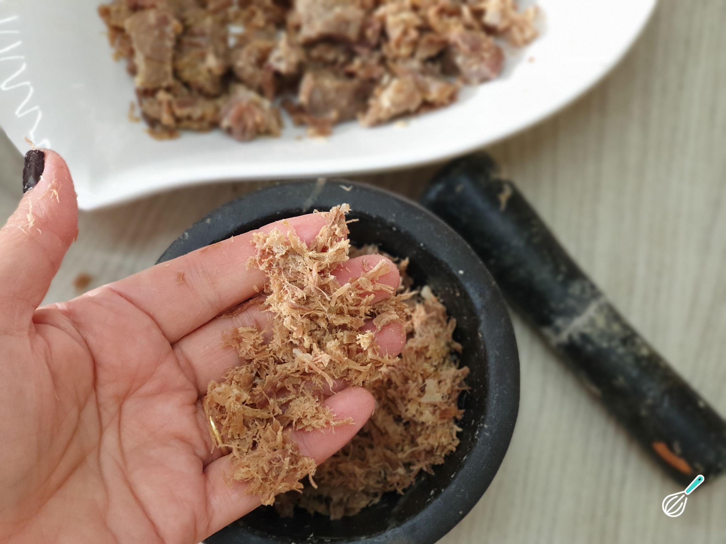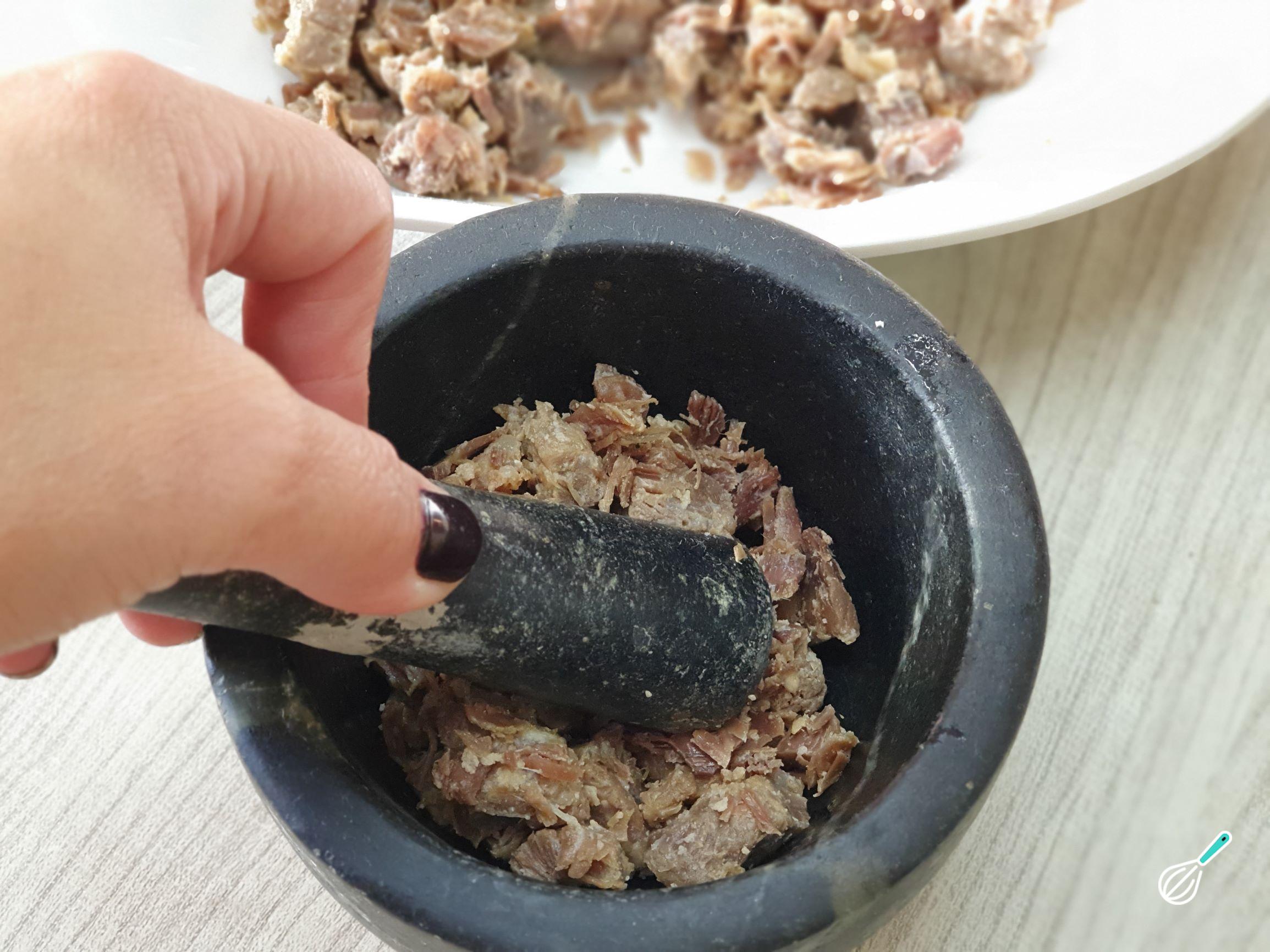 Dica: Se você não tiver pilão em casa, poderá usar processador de alimentos ou, em último caso, desfiar bem fininho a carne com as mãos.
