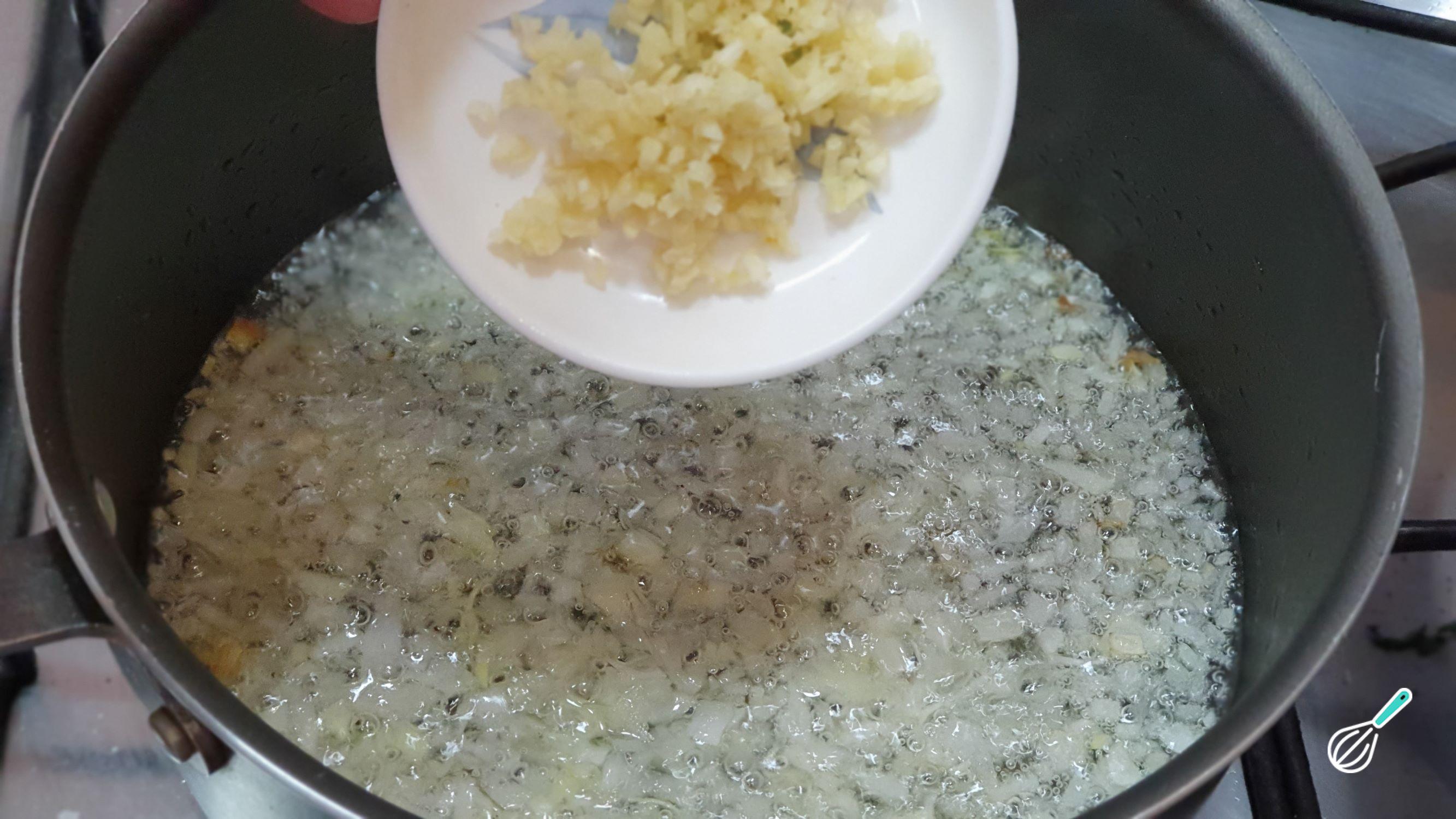 Em uma panela com o azeite, refogue a cebola até suar e acrescente o alho. Misture bem.