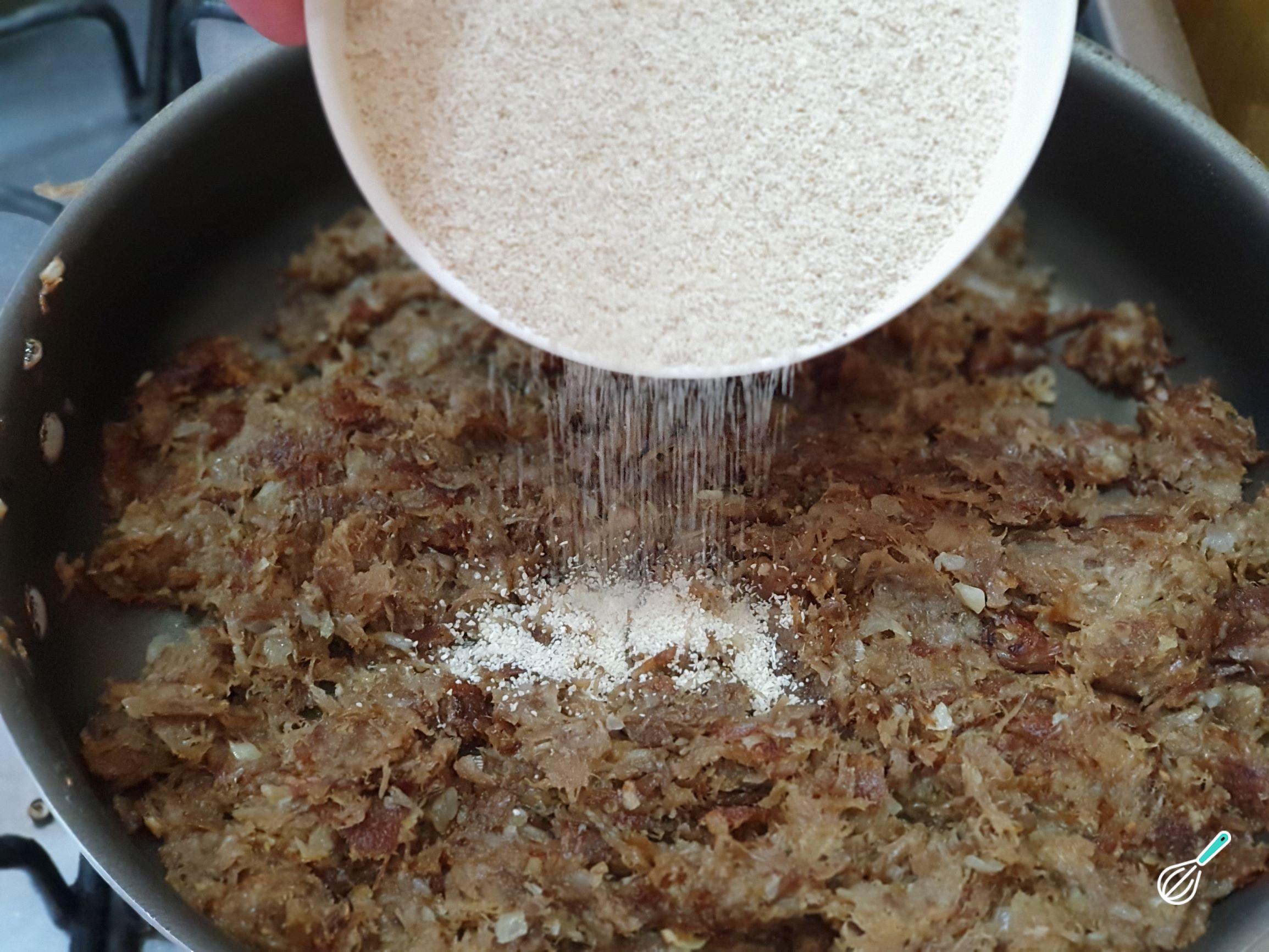 Quando a cebola começar a dourar, junte a carne pilada, misture bem e mexa até que ela toste bem, por inteiro, ficando bem dourada. Em seguida adicione a farinha de mandioca.