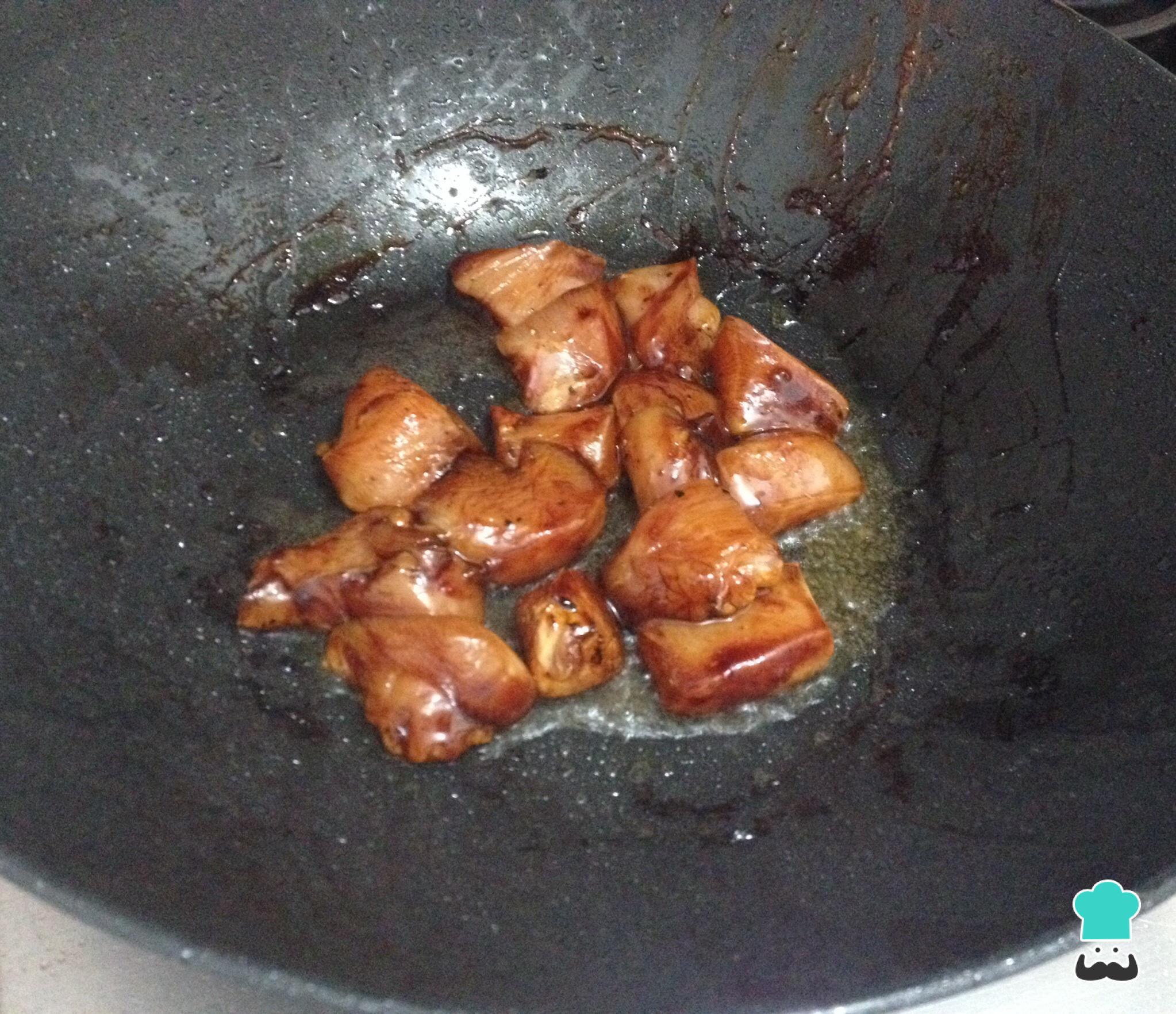 Marine o peito de frango cortado em cubos com um pouco do molho anterior. Tempere com sal e pimenta e salteie em um wok até ficar dourado. Retire e reserve.