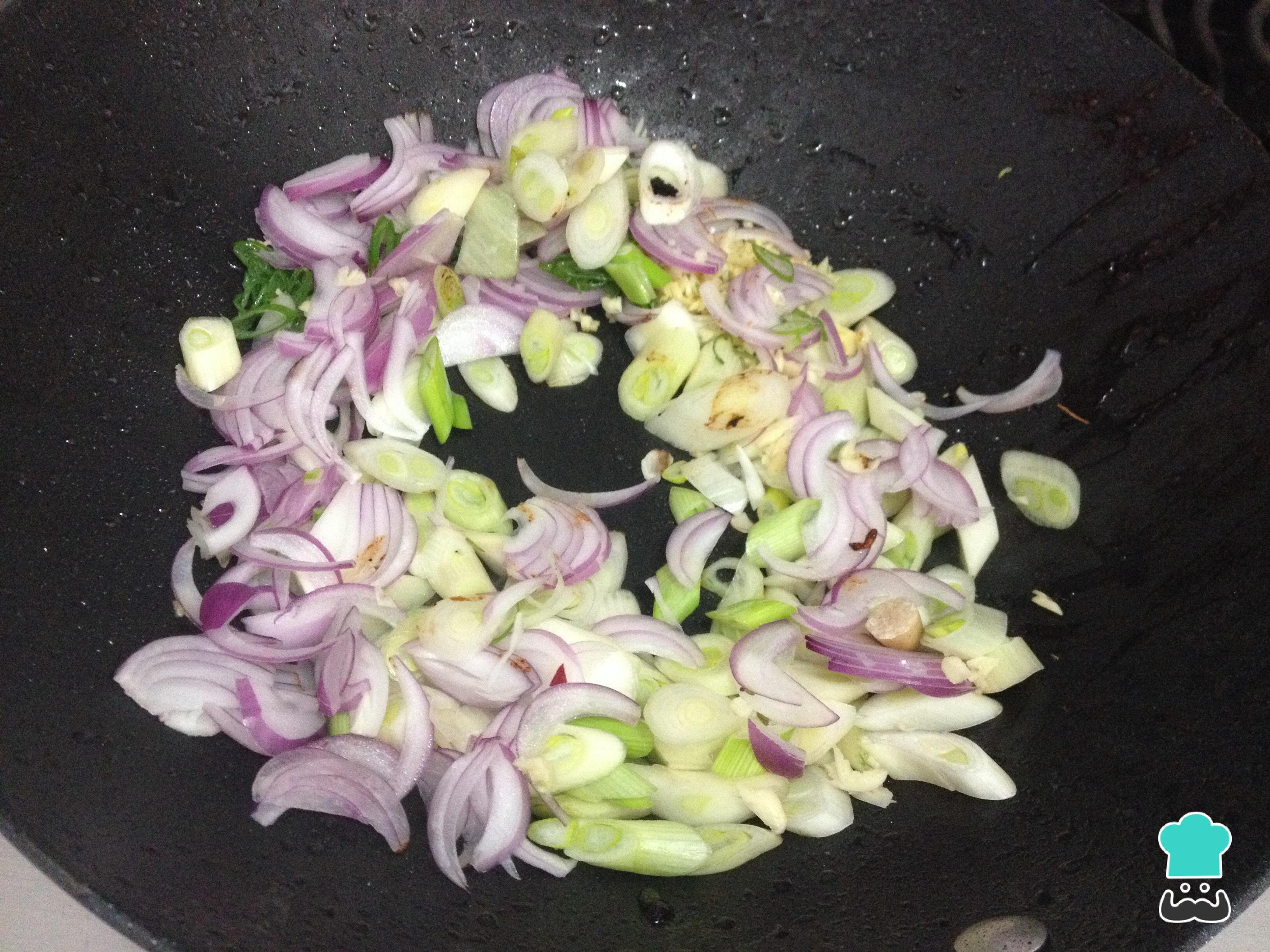 Na mesma wok refogue a cebola cortada em pétalas, o alho-poró cortado em rodelas e o alho e o gengibre picados finamente. Tempere com sal e pimenta.