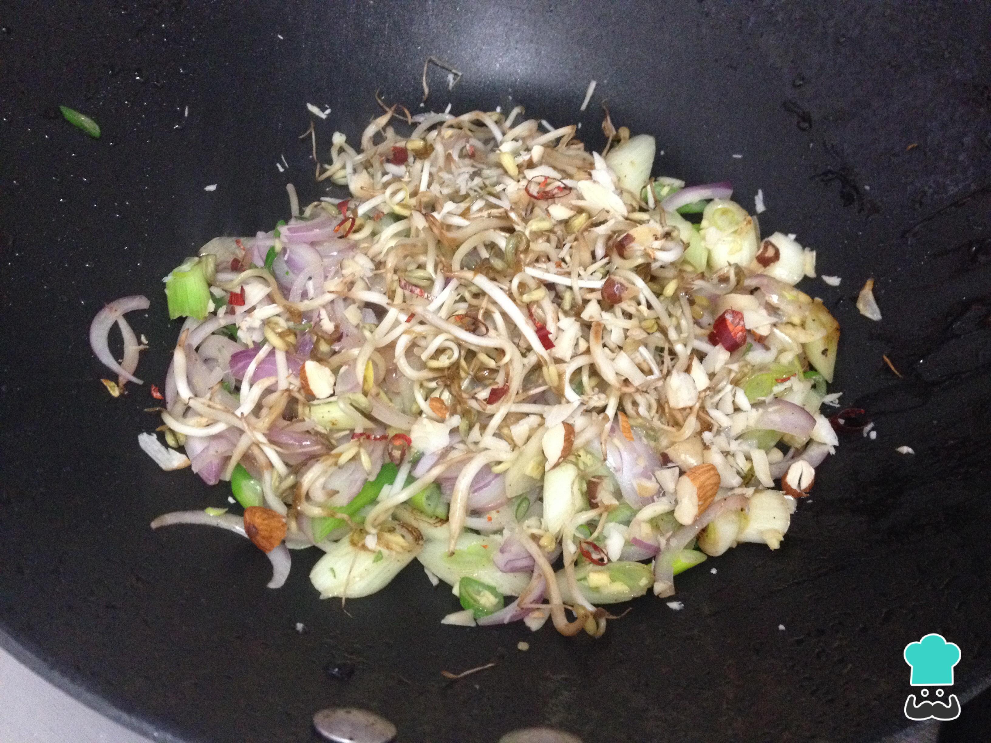 Adicione os brotos de soja, os amendoins e a pimenta calabresa, cozinhe por mais alguns minutos.