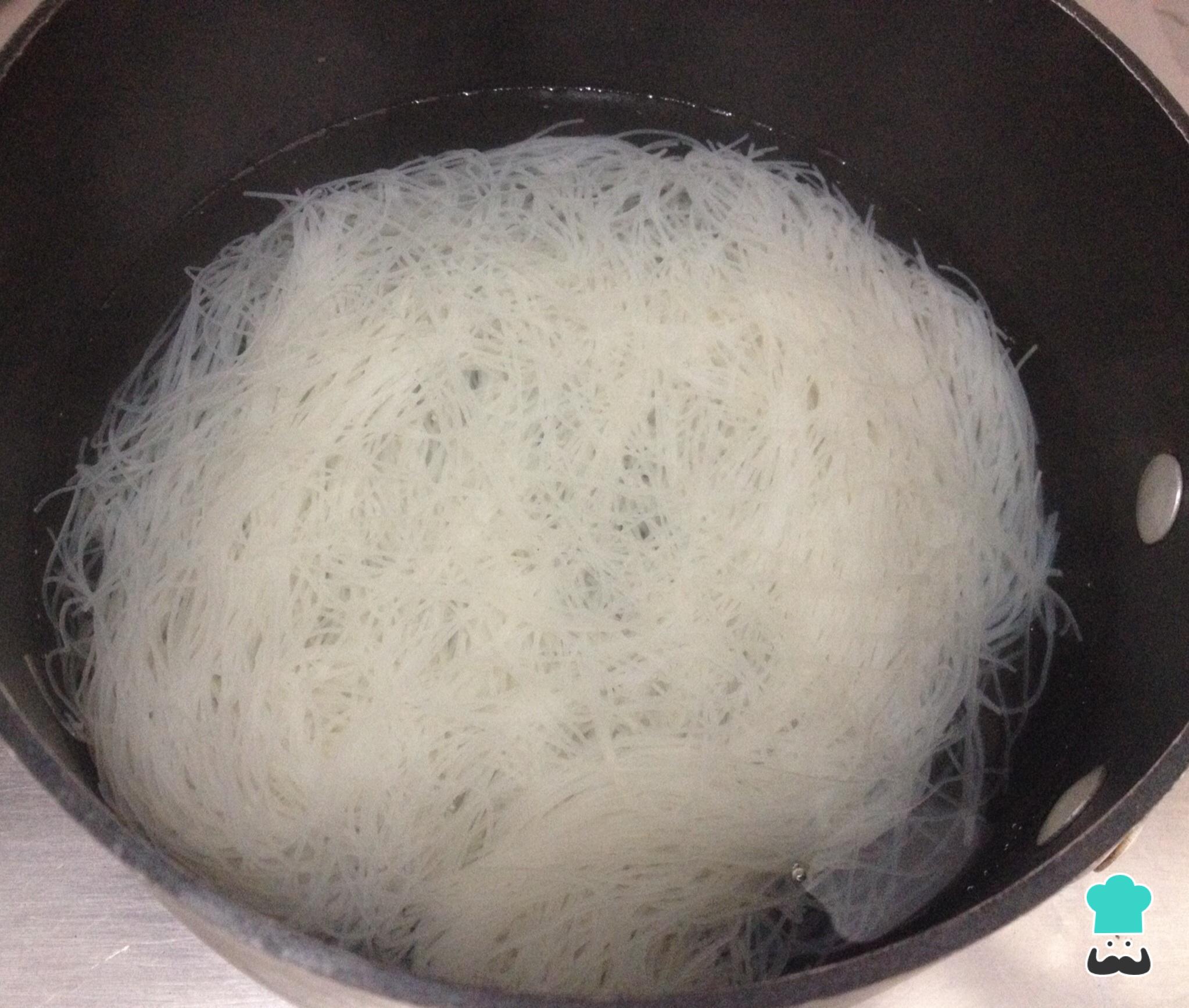 Adicione a água em uma panela e leve ao fogo. Quando estiver fervendo, desligue e adicione o espaguete, cozinhe até ficar al dente.