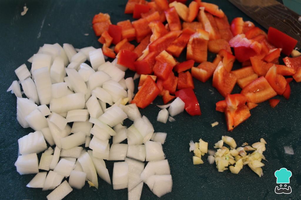 Para preparar paella de camarão, comece por descascar e lavar todos os legumes. Pique a cebola, o aipo e o alho e o pimentão em tirinhas. Separe as coxas de frango em dois pedaços e lave e limpe bem o camarão.