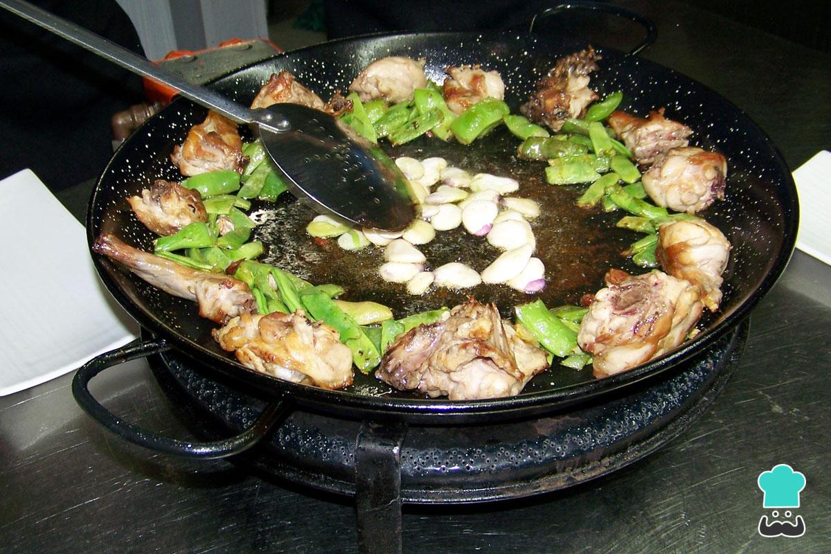 Separadamente, coloque uma panela de paella no fogo, junte o azeite de oliva e incorpore a cebola, juntamente com o alho e o aipo. Deixe dourar, junte o frango, e deixe cozinhar.