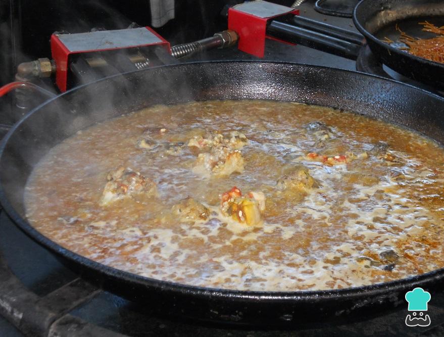 Dissolva o açafrão em um pouquinho de caldo e devolva à panela do mesmo. Misture tudo, adicionando o caldo na panela de paella até cobrir os ingredientes. Deixe cozinhar em fogo médio por 40 minutos.