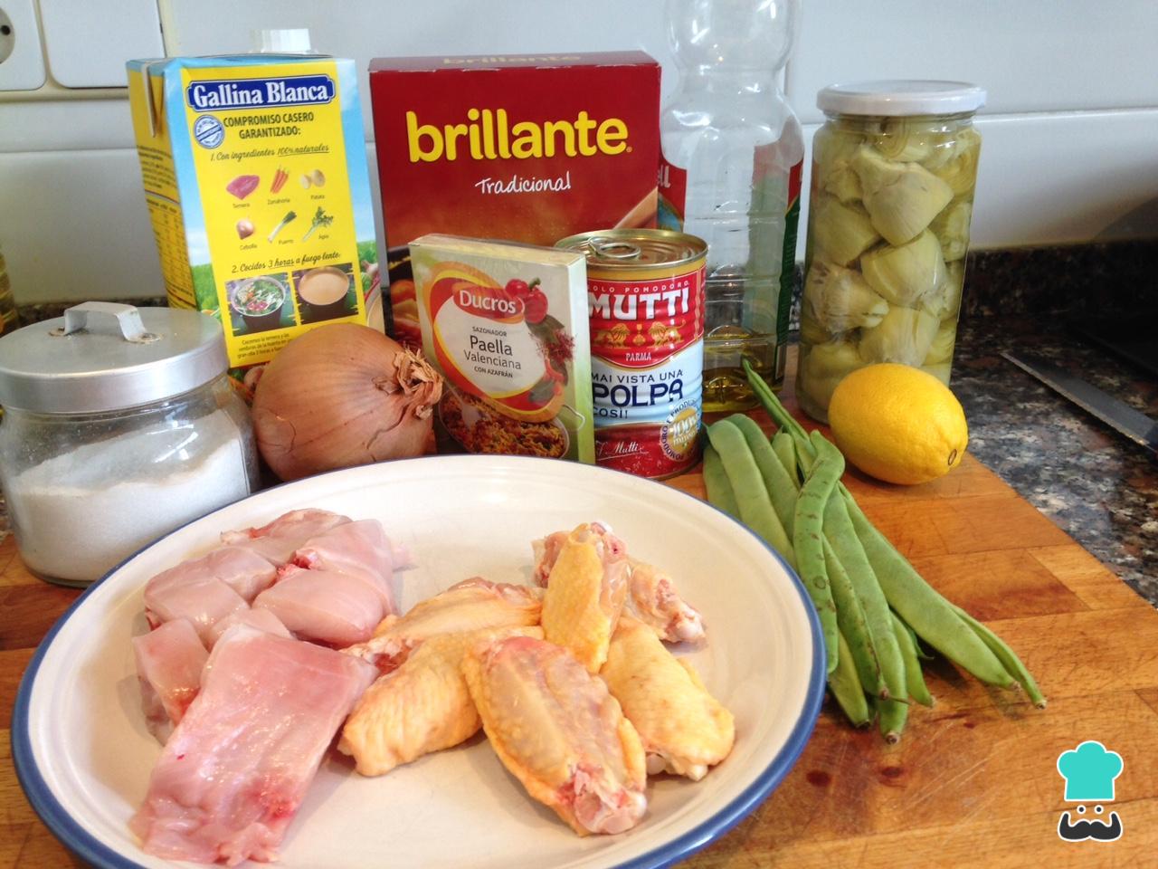 Prepare e organize os ingredientes para a paella valenciana. Para esta receita espanhola escolha um arroz especial para paellas, desse modo o arroz fica soltinho. A versão tradicional leva frango e coelho, embora em muitas casas não se use o coelho. As alcachofras também são opcionais. Em outras versões não se utiliza caldo e em seu lugar acrescenta-se água, mas a receita fica muito mais saborosa com caldo de frango.