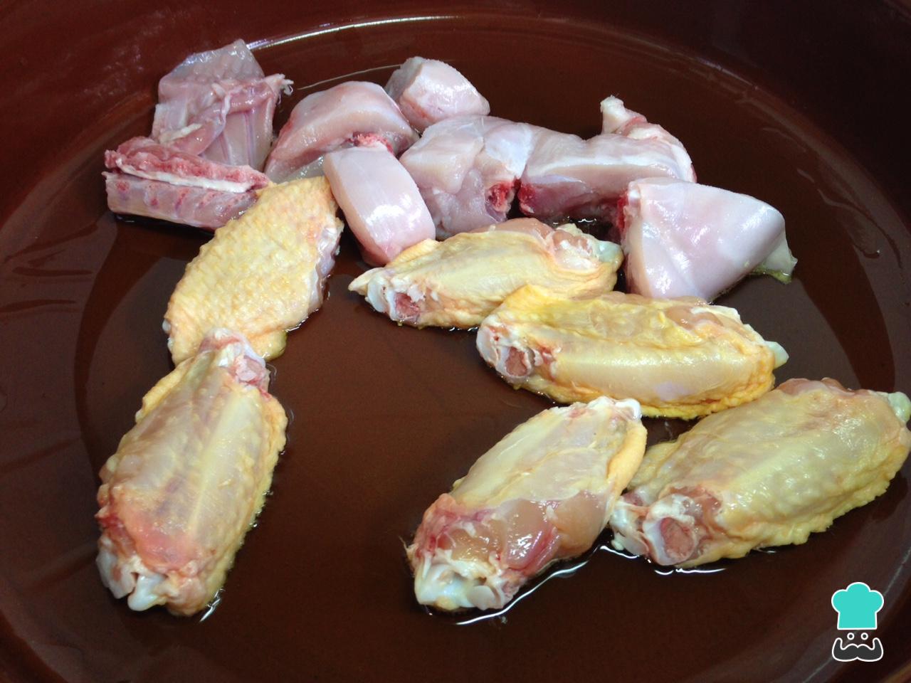 Comece por fritar a carne. Numa paellera (espécie de frigideira própria para fazer paella) ou numa frigideira grande e baixa, verta um pouco de azeite e, quando estiver bem quente, ponha os pedaços de frango e coelho para dourar.