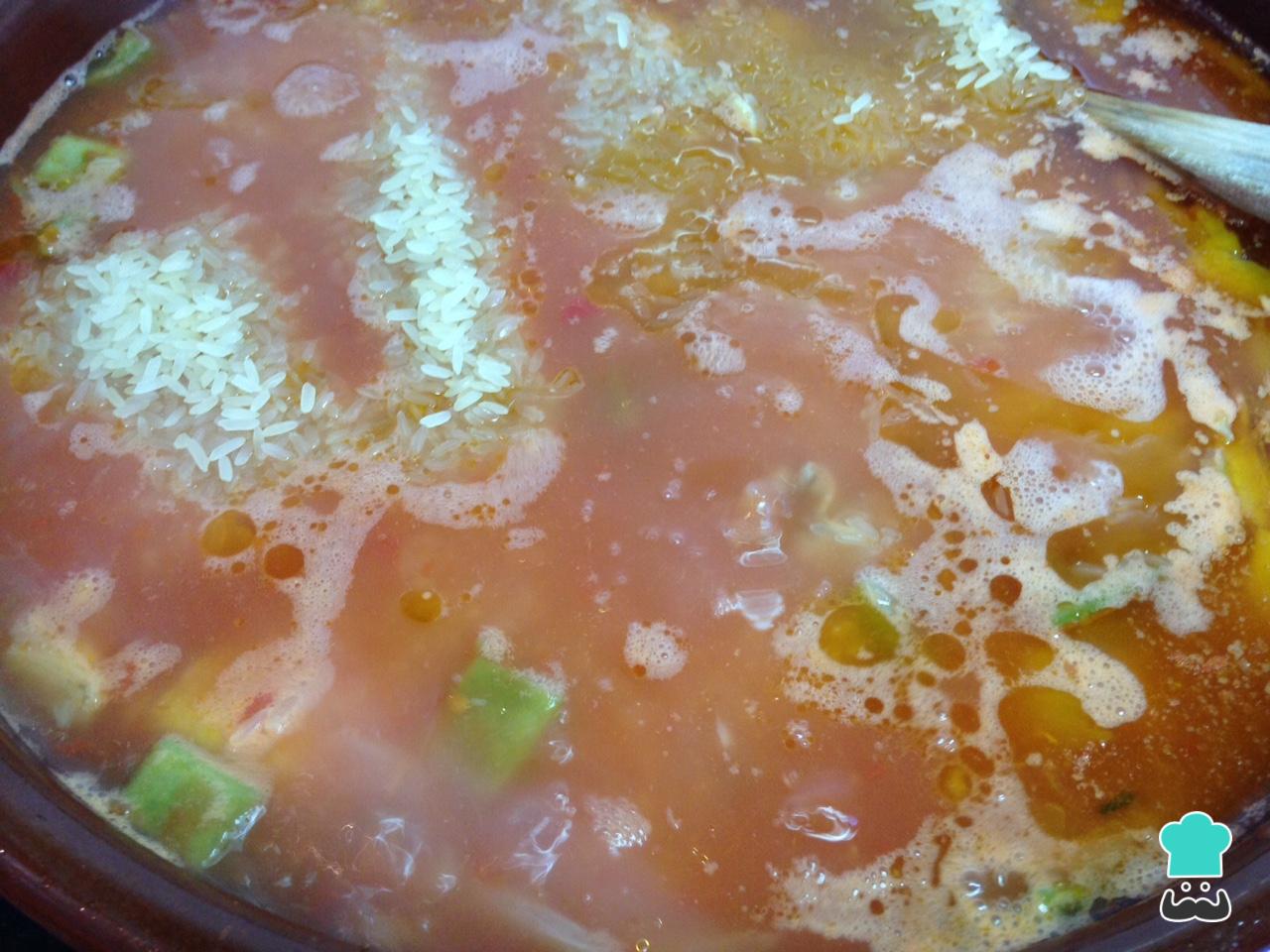 Quando o caldo estiver a ferver, acrescente o arroz à paellera. Segundo a versão original, há que acrescentar o arroz em forma de cruz. Com uma escumadeira reparta o arroz de forma que fique uniforme e todo coberto de caldo. Depois disso o arroz não se mexe mais.