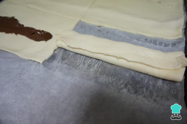 Espalhe um pouco de creme de chocolate no centro de cada retângulo de massa, sem chegar nas beiradas. Dobre a massa por cima do creme, primeiro uma lateral e depois a outra, como na foto.