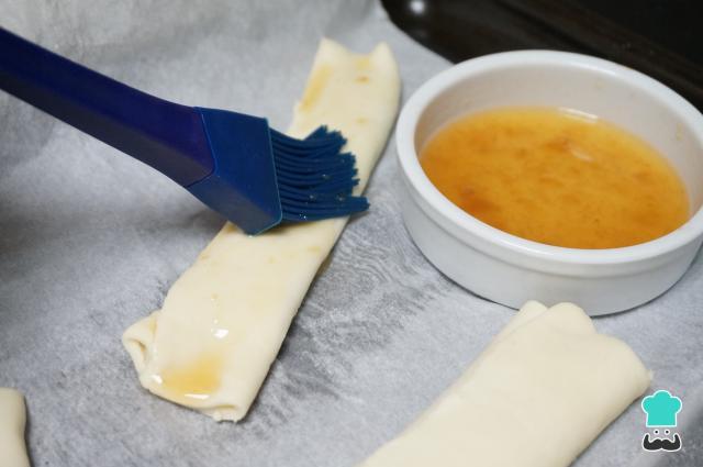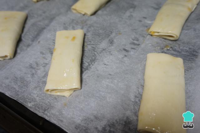 Vire cada porção de massa folhada recheada de forma a que a junção da massa fique para baixo. Espalhe um pouco de geleia ou de ovo batido em cada um desses pedaços de massa folhada, para que fiquem douradinhos depois de assar.