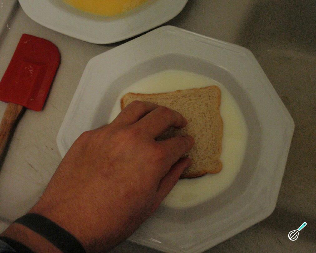Em seguida, para fazer o Pain Perdu Masterchef, mergulhe as fatias de brioche no leite. Não precisa esperar que absorvam todo o leite, as fatias devem ficar apenas ligeiramente umedecidas.