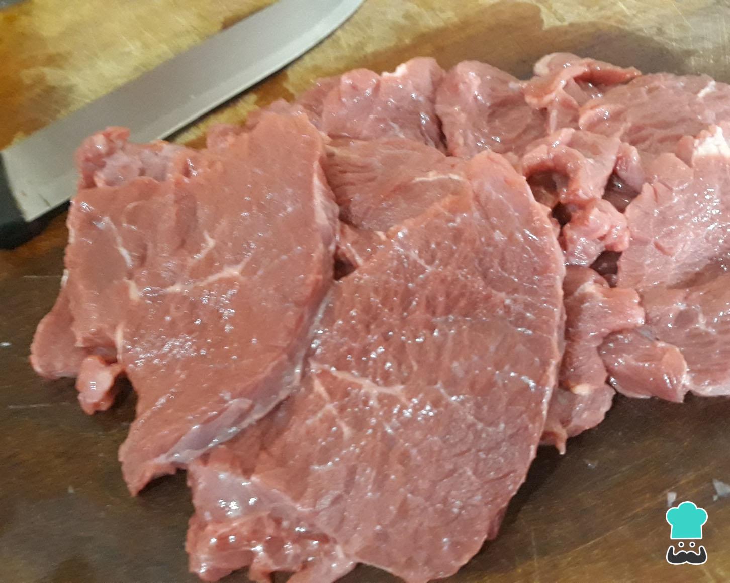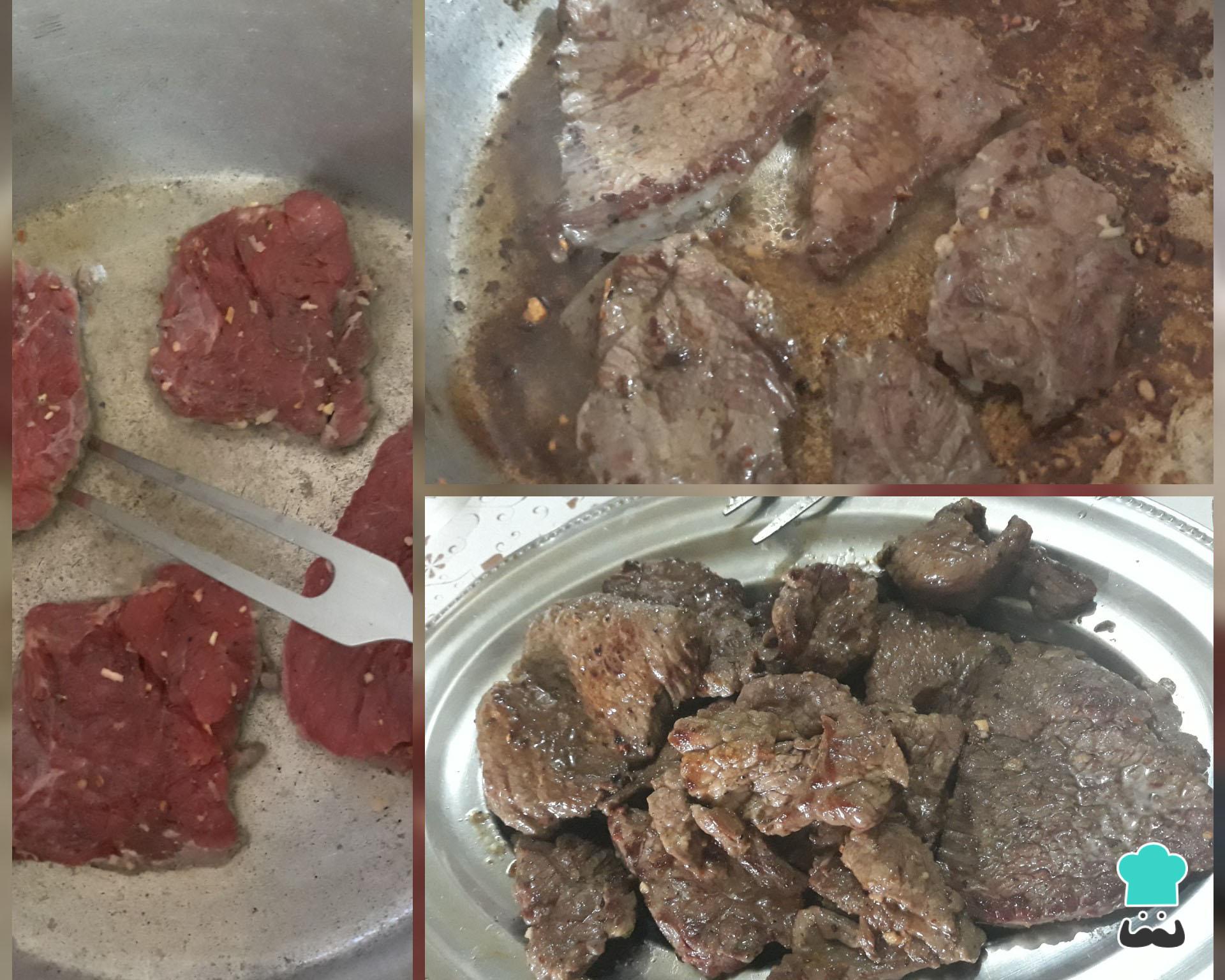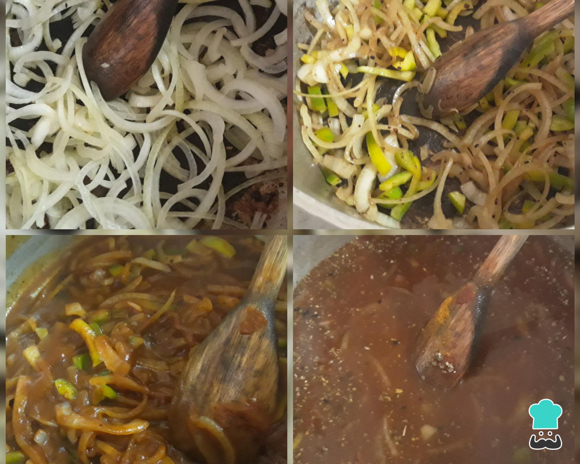 Na panela em que dourou os bifes coloque a cebola e refogue até ficar macia e transparente. Acrescente o pimentão, o extrato, tempere com chimichurri, oréganos e uma pitada de sal, coloque os bifes e cubra com água ou caldo de carne.