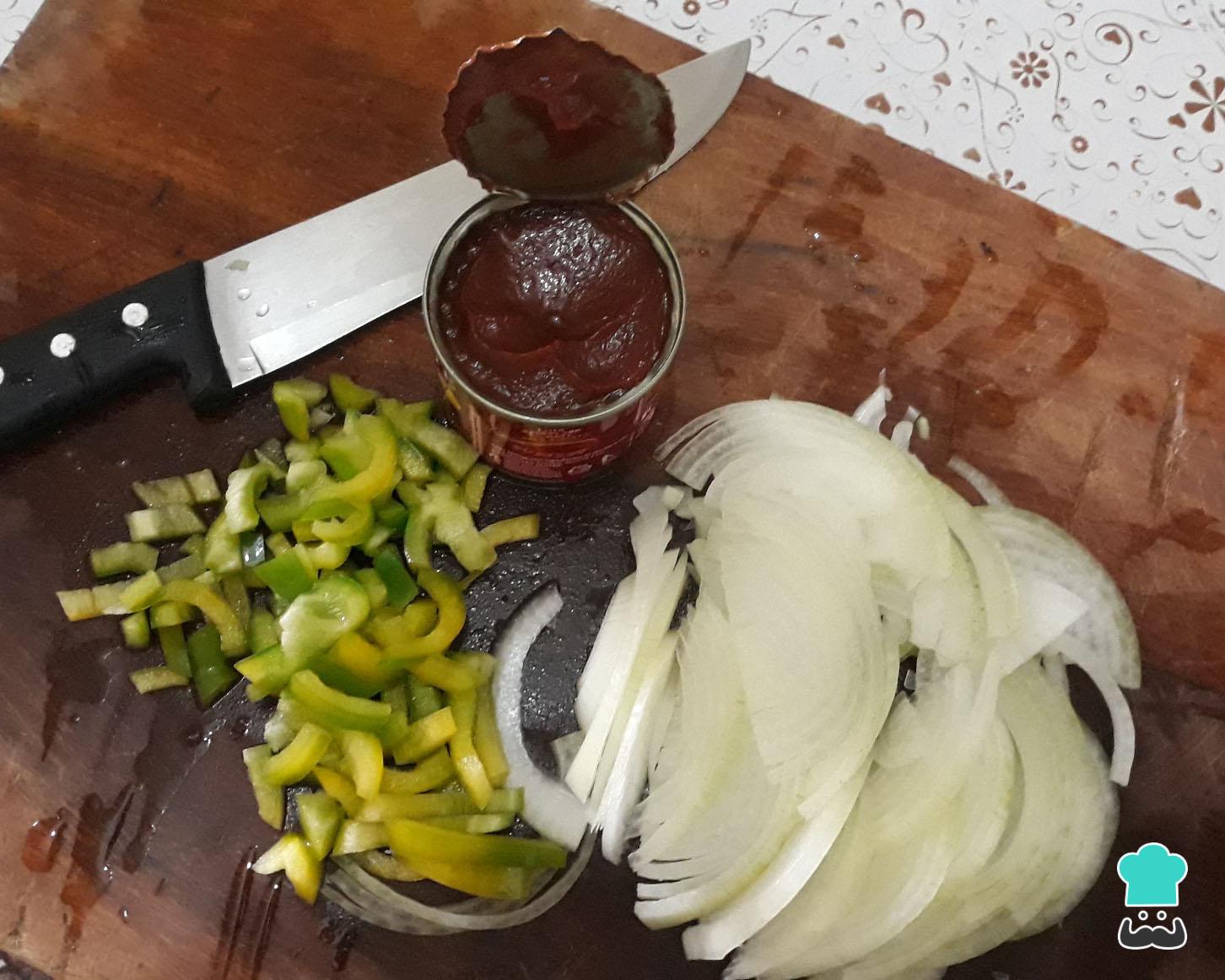 Organize os demais ingredientes: descasque a cebola e corte em tiras junto com o pimentão, como na fotografia.