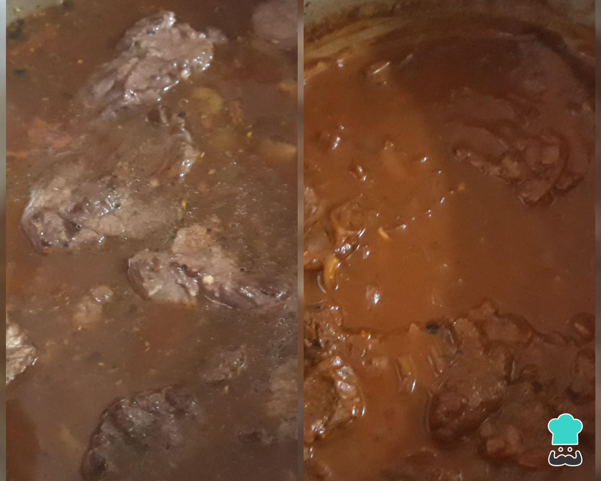 Tampe a panela e baixe o fogo. Deixe cozinhar por aproximadamente 20 minutos ou até o bife ficar macio e o molho apurado. Abra, prove para acertar o sal e desligue o fogo.