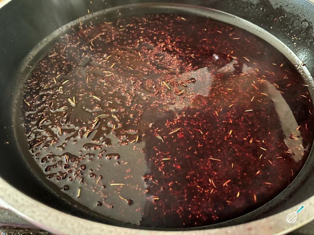 Depois de dourar os alimentos, retire-os, reserve e, no fundo da panela, adicione o vinho com o mel, a mostarda e os temperos, exceto a mistura de especiarias com sementes. Pode usar alho e cebola desidratados, orégano, tomilho, alecrim, manjericão e pimenta-do-reino junto com linhaça, quinoa e sementes de girassol. Reduza até que o álcool do vinho evapore e desligue o fogo.