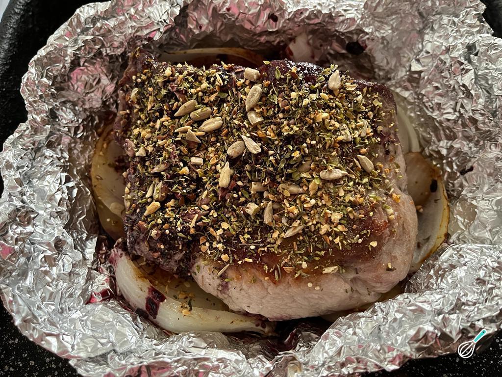 Corte o papel alumínio e coloque em uma assadeira junto com as cebolas, faça uma cama para colocar a carne sobre elas. Polvilhe a mistura de especiarias com sementes e adicione a redução de vinho nas laterais. Com outra folha de alumínio, envolva a carne e leve ao forno por cerca de 40 minutos no forno pré-aquecido a 200ºC.