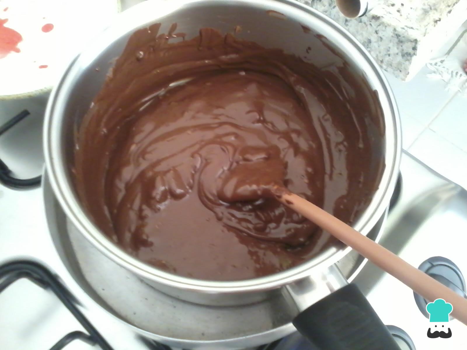 Espere atingir os 50ºC (o que deverá demorar 4-5 minutos) e adicione o cacau em pó e as gotas de chocolate. Mexa até este chocolate derreter e estar bem misturado, e desligue o fogo. Deixe esfriar.