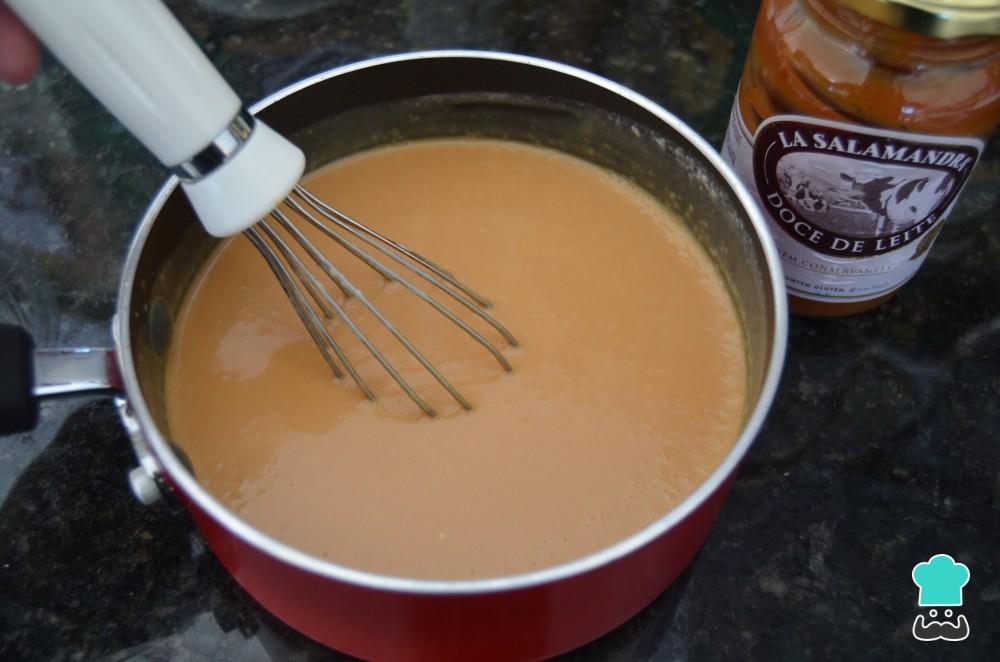 É bem simples fazer paleta mexicana em casa! O primeiro passo é levar ao fogo o creme de leite e metade do doce de leite, e ficar mexendo até ambos os ingredientes ficarem bem incorporados e quase fervendo. Desligue o fogo e deixe esfriar.