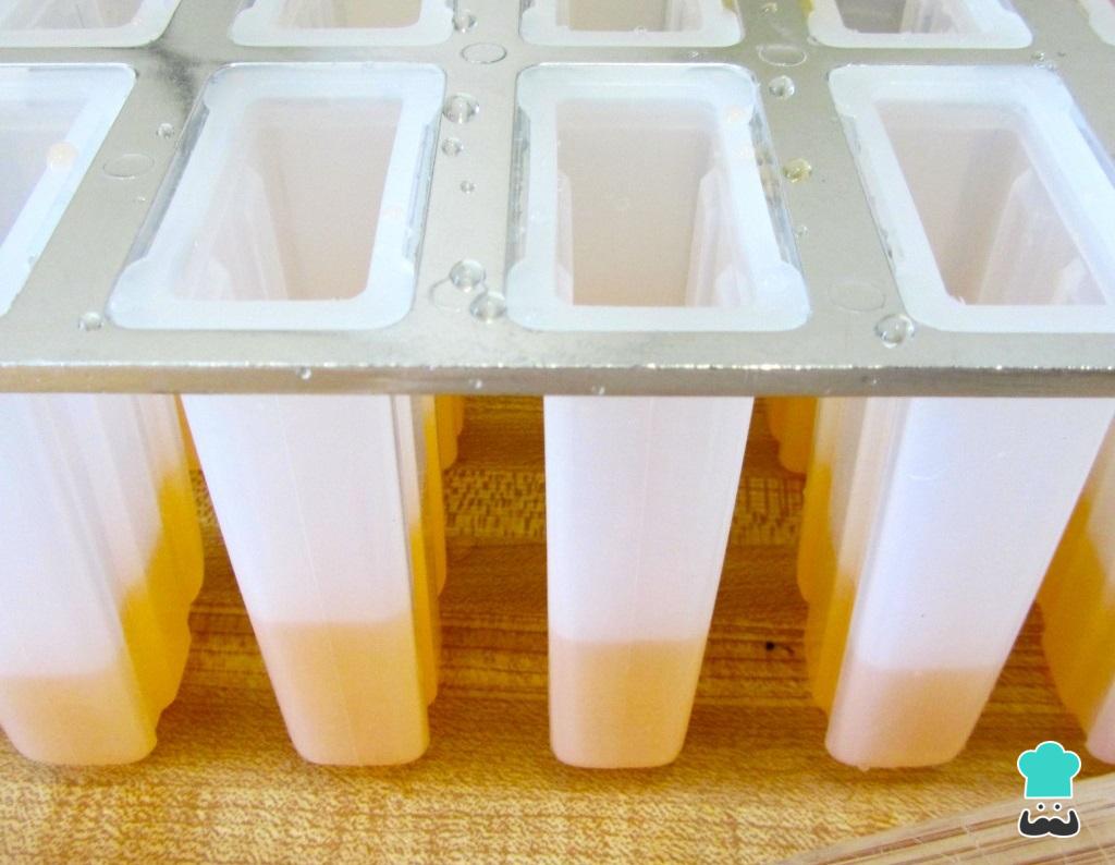 O passo seguinte é encher as forminhas de paleta, até faltar cerca de 1 dedo até ao topo. Cubra com plástico filme, para evitar cristalizar, e reserve no freezer por 1h30. Reserve a restante mistura de creme de leite e doce de leite.