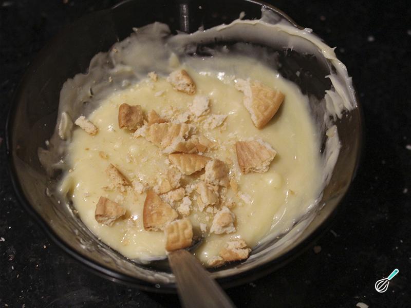 Pique as amêndoas e as bolachas em pedaços de tamanho a seu gosto e adicione ao chocolate junto com o leite. Misture bem todos estes ingredientes.