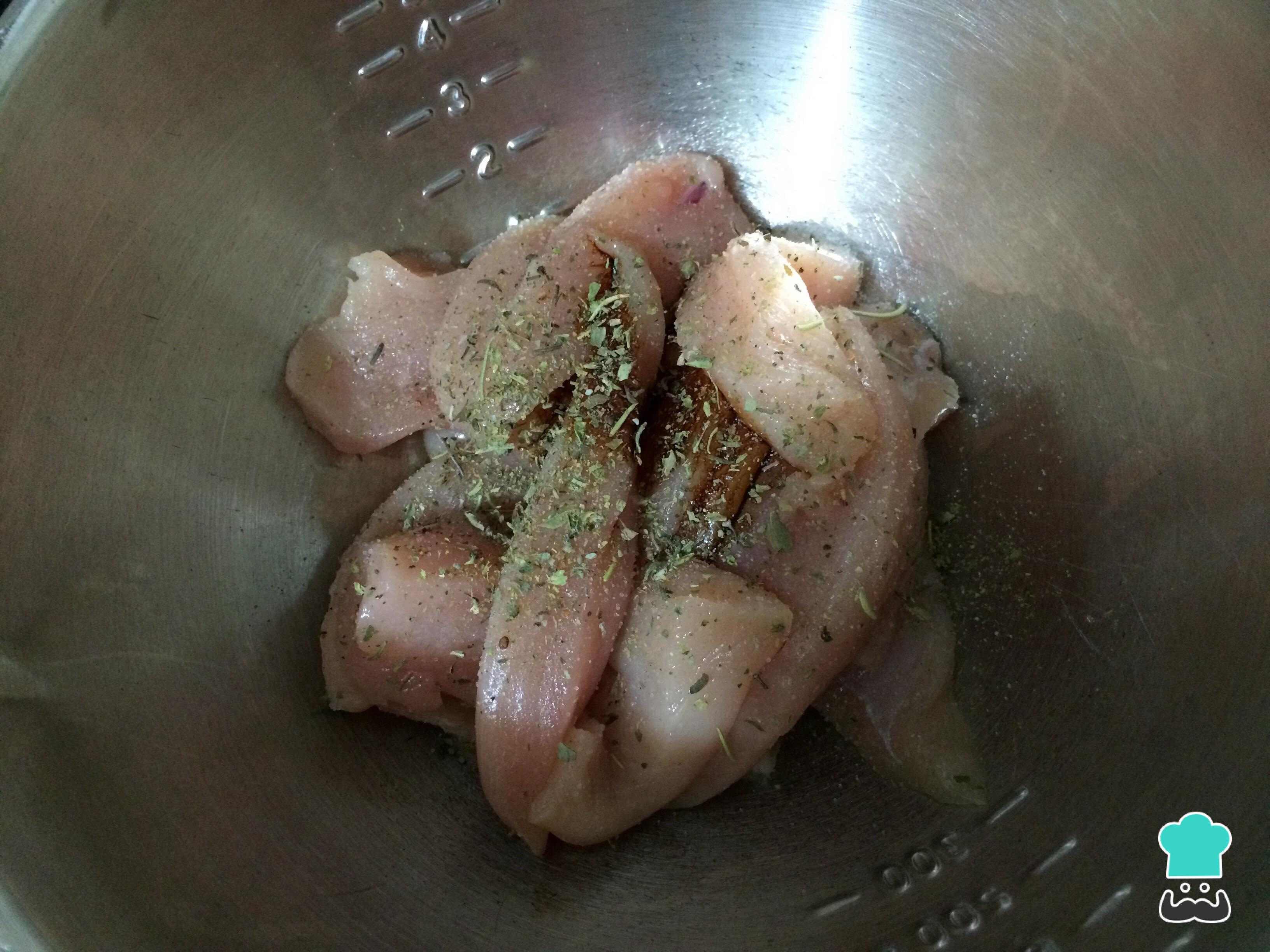 Corte o peito de frango em tiras grossas e tempere a gosto. Para isso, adicione uma pitada de sal, pimenta, ervas e um fiozinho de molho de soja. Misture muito bem e deixe repousar por 15 minutos.