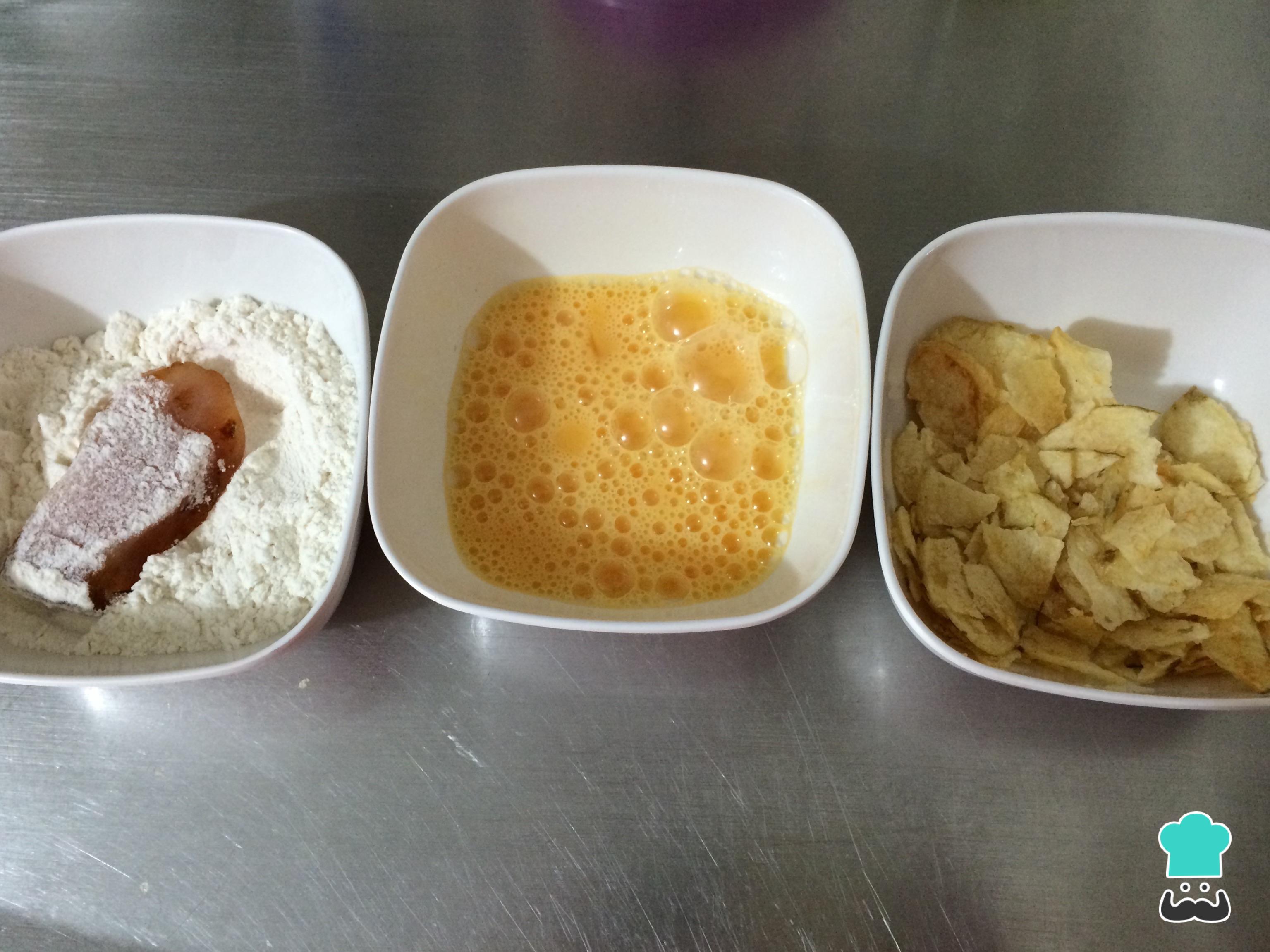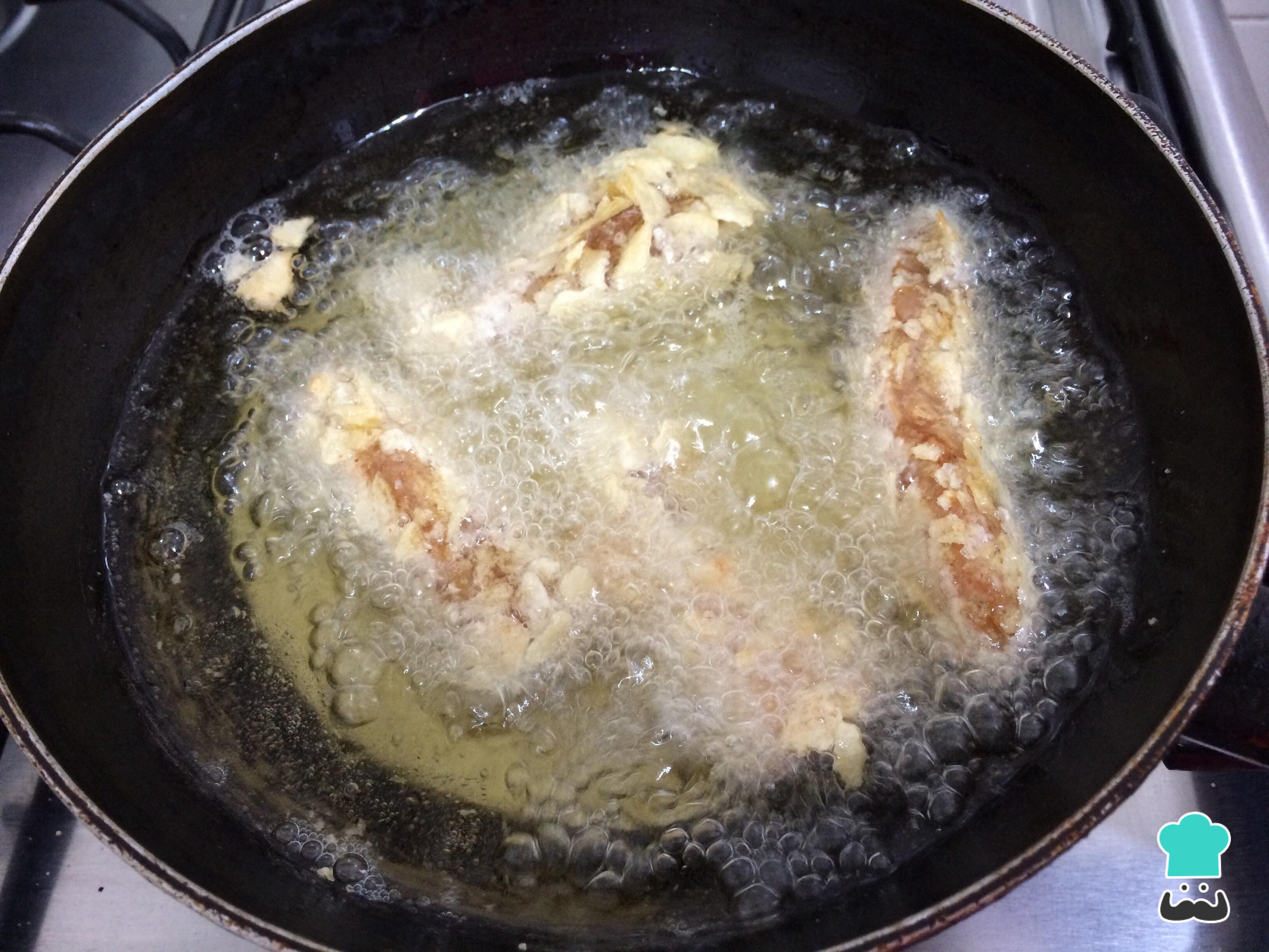 Envolva o peito de frango em cada um dos ingredientes, pela ordem indicada, e coloque fritando em óleo quente abundante. Frite durante 2-3 minutos, ou até que fiquem dourados, e retire para papel absorvente.