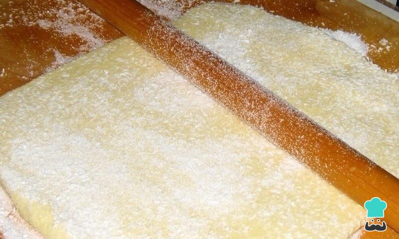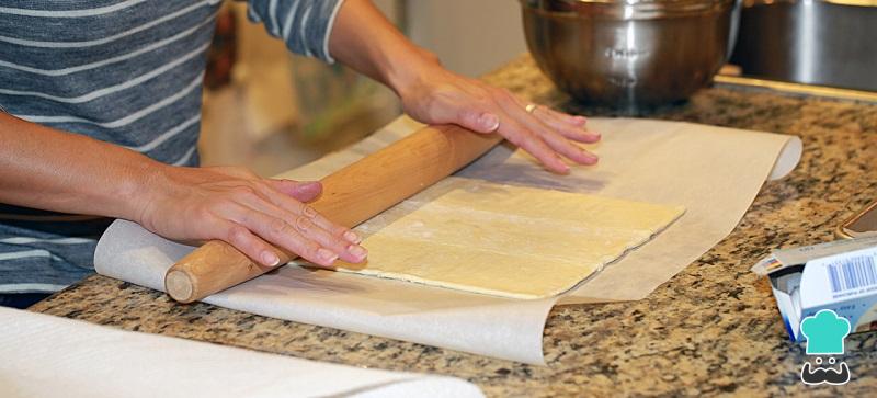 Para fazer seus palmiers caseiros comece por estender a massa folhada sobre uma superfície plana e limpa, como a bancada da sua cozinha, polvilhada com açúcar. Se preferir pode fazer massa folhada caseira para utilizar nesta receita.