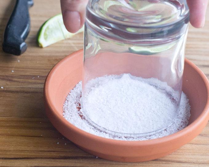 Uma das partes mais importantes desse drink com tequila é a borda do copo. Para isso, você deve passar limão por toda a borda e, em seguida, virar o copo para baixo em um prato com sal. Assim, apenas a borda do copo ficará com sal, numa camada mais uniforme.