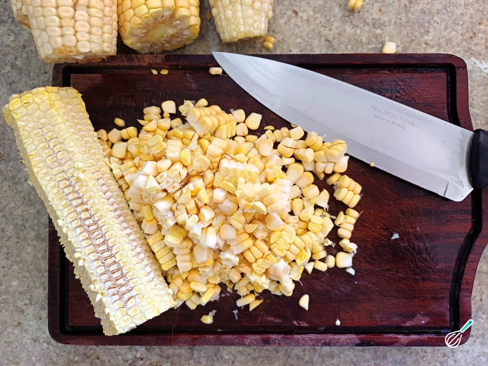 Limpe bem as espigas de milho retirando todo os fiapos (cabelinho) e com uma faca, retire todo o milho da espiga.