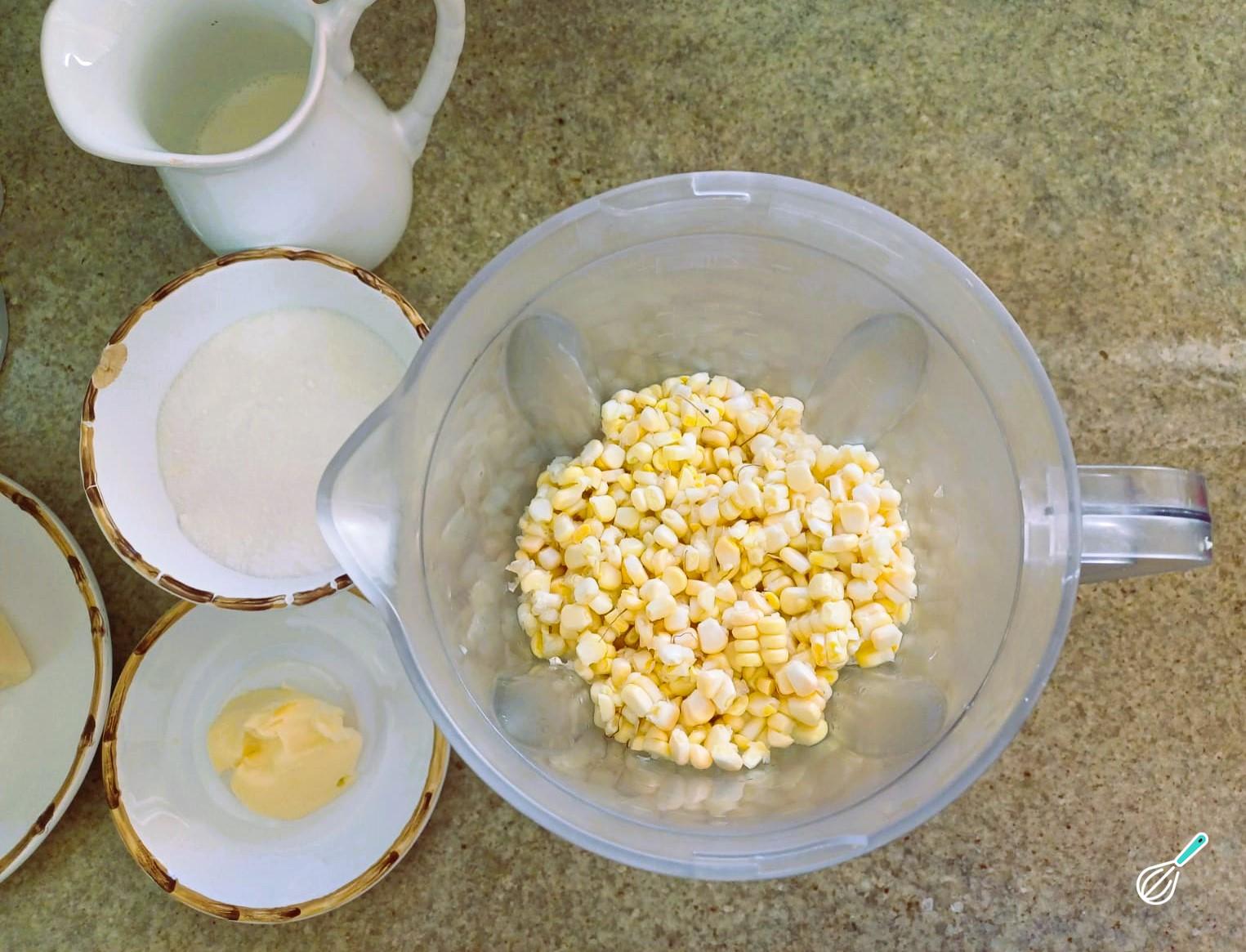 Coloque o milho em um liquidificador e bata adicionando o leite aos poucos, até atingir a textura lisa e homogênea.