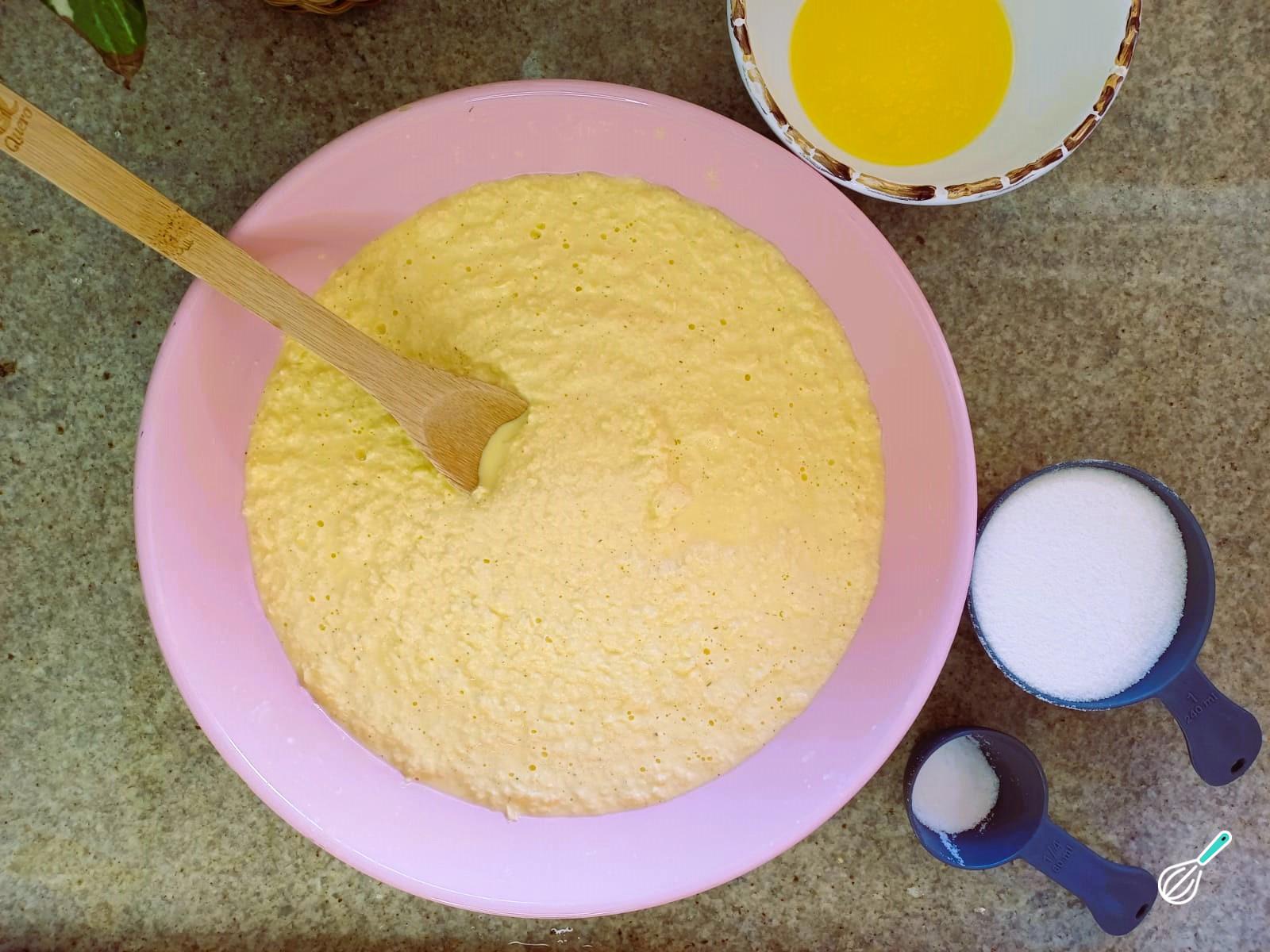 Transfira a massa do milho para uma travessa grande e adicione o açúcar, o sal e a manteiga derretida, e misture bem até incorporar todos os ingredientes.