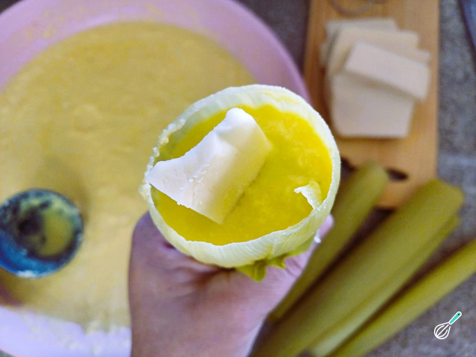 Segurando firme, acrescente um pedaço de queijo minas no fundo e despeje a massa da pamonha no copo de palha, completando até ficar uma margem de um dedo na borda para não vazar.