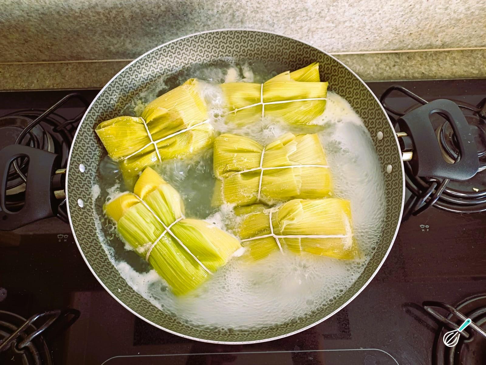 Coloque água para ferver em uma panela grande, suficente para cobrir todas as pamonhas. Quando estiver fervendo adicione as pamonhas. Deixe cozinhando por cerca de 40-50 minutos em fogo baixo.