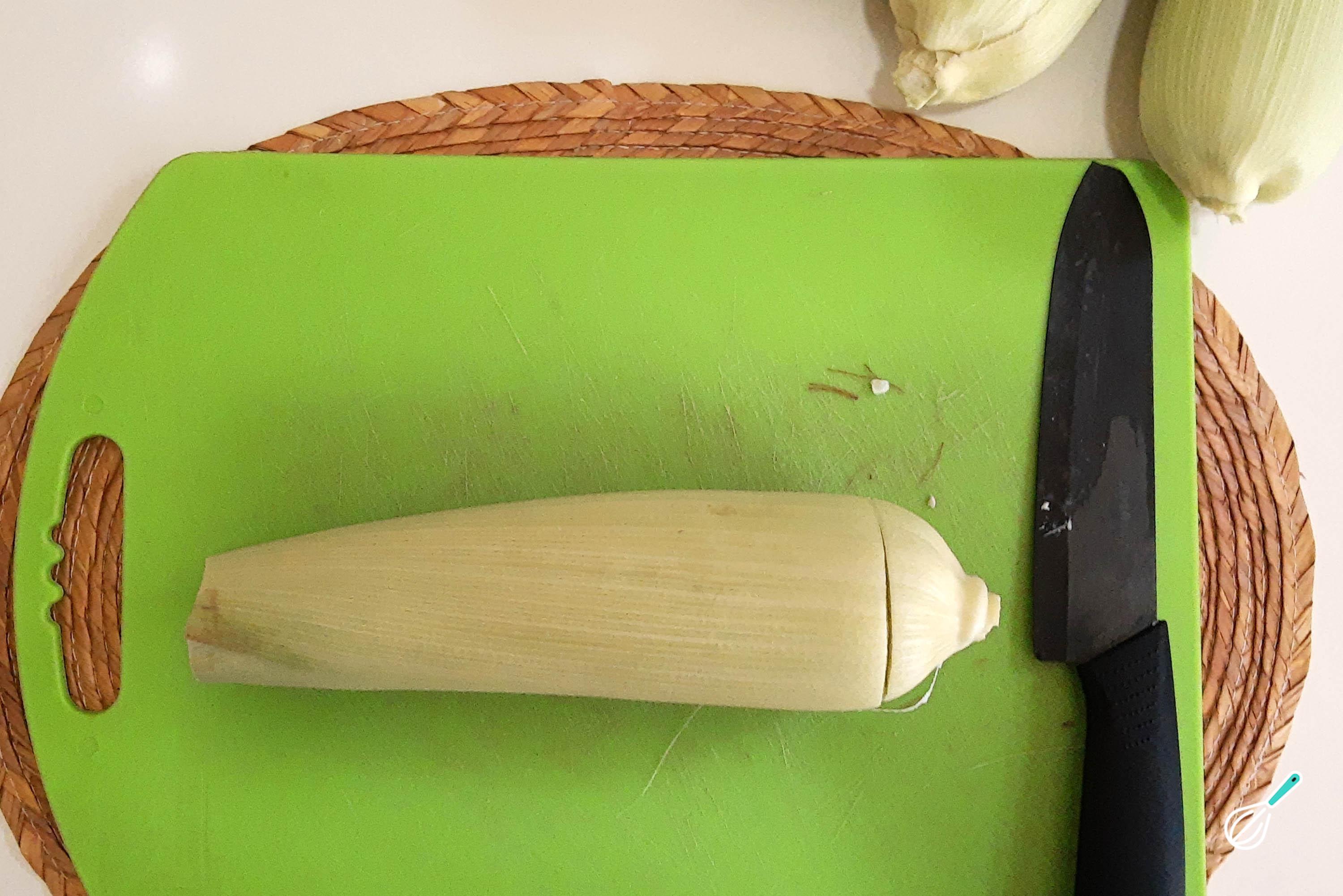O passo seguinte desta pamonha caseira é separar o milho do sabugo. Para isso você pode usar uma faca afiada ou ralar o milho na posição vertical. Você também pode se apoiar em um moinho de mão.