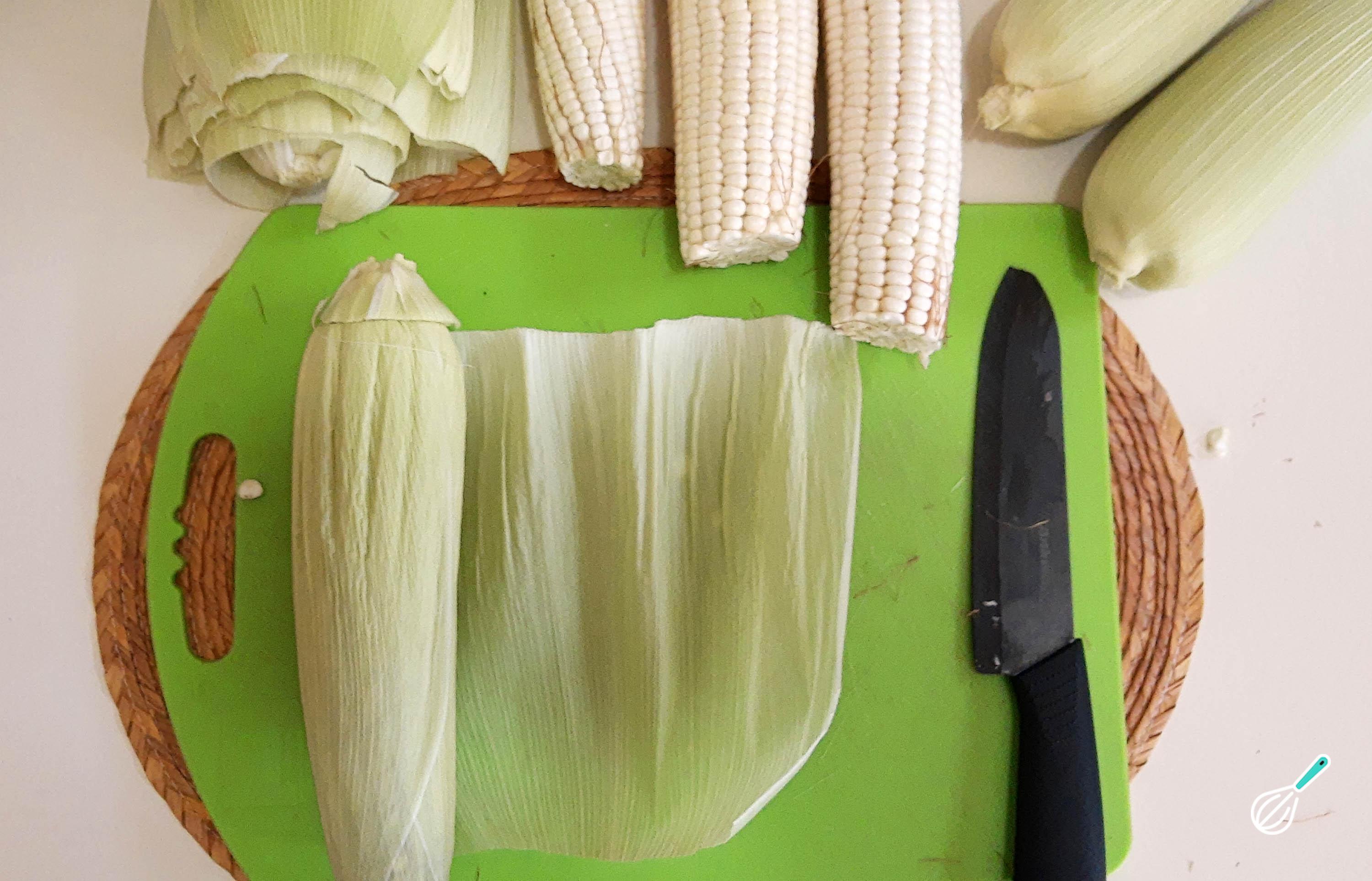 Fazer pamonha doce caseira é muito simples e não requer muitos ingredientes! Comece por tirar a palha do milho (as folhas em redor da espiga), pois elas nos servirão para a preparação desta sobremesa tradicional. Para isso, faça um corte profundo em redor do topo da espiga, usando uma faca afiada, sem separar os grãos de milho.