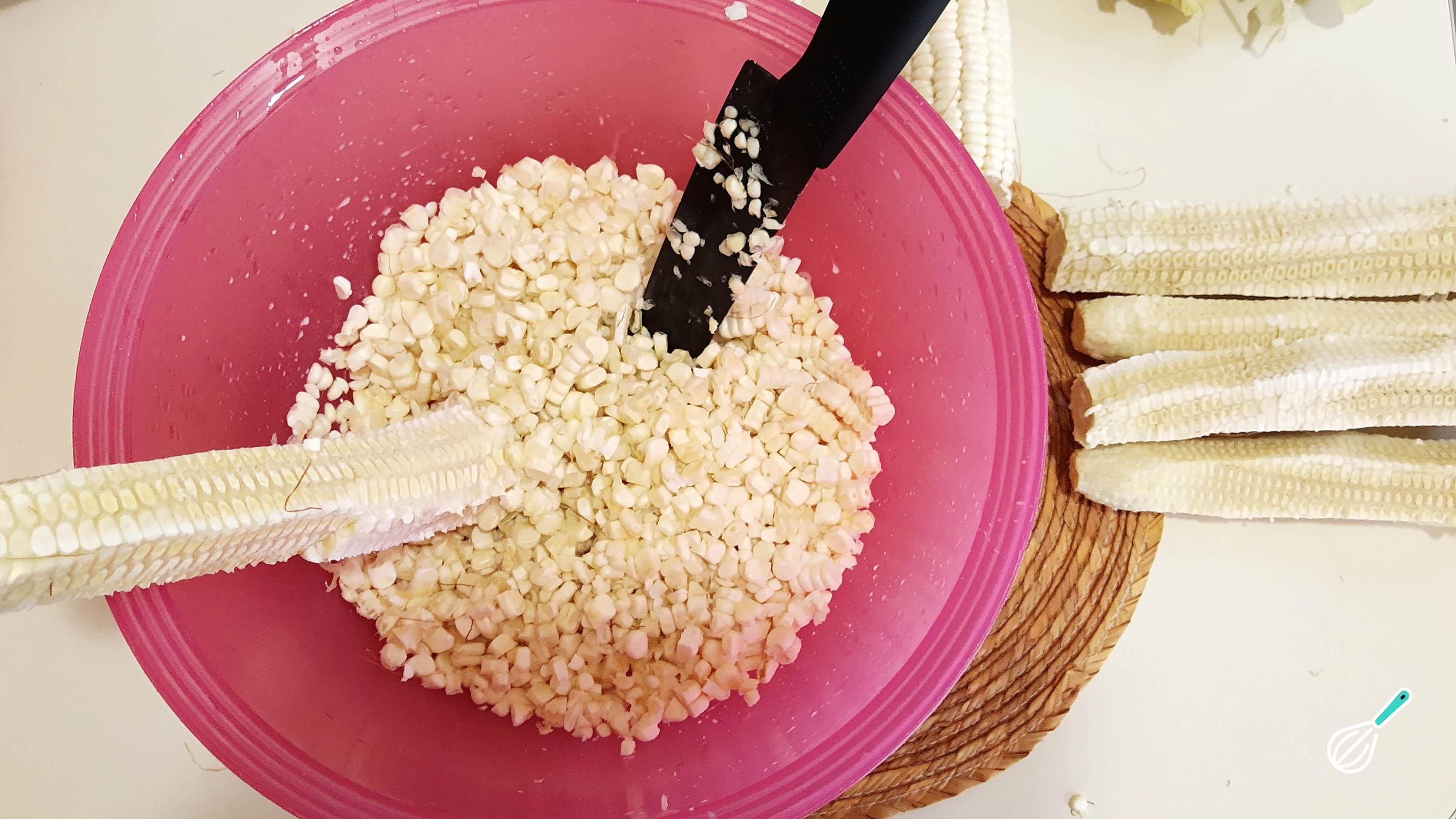 Dica: Não corte nem rale os grãos de milho muito próximos da espiga, para evitar pedaços duros.