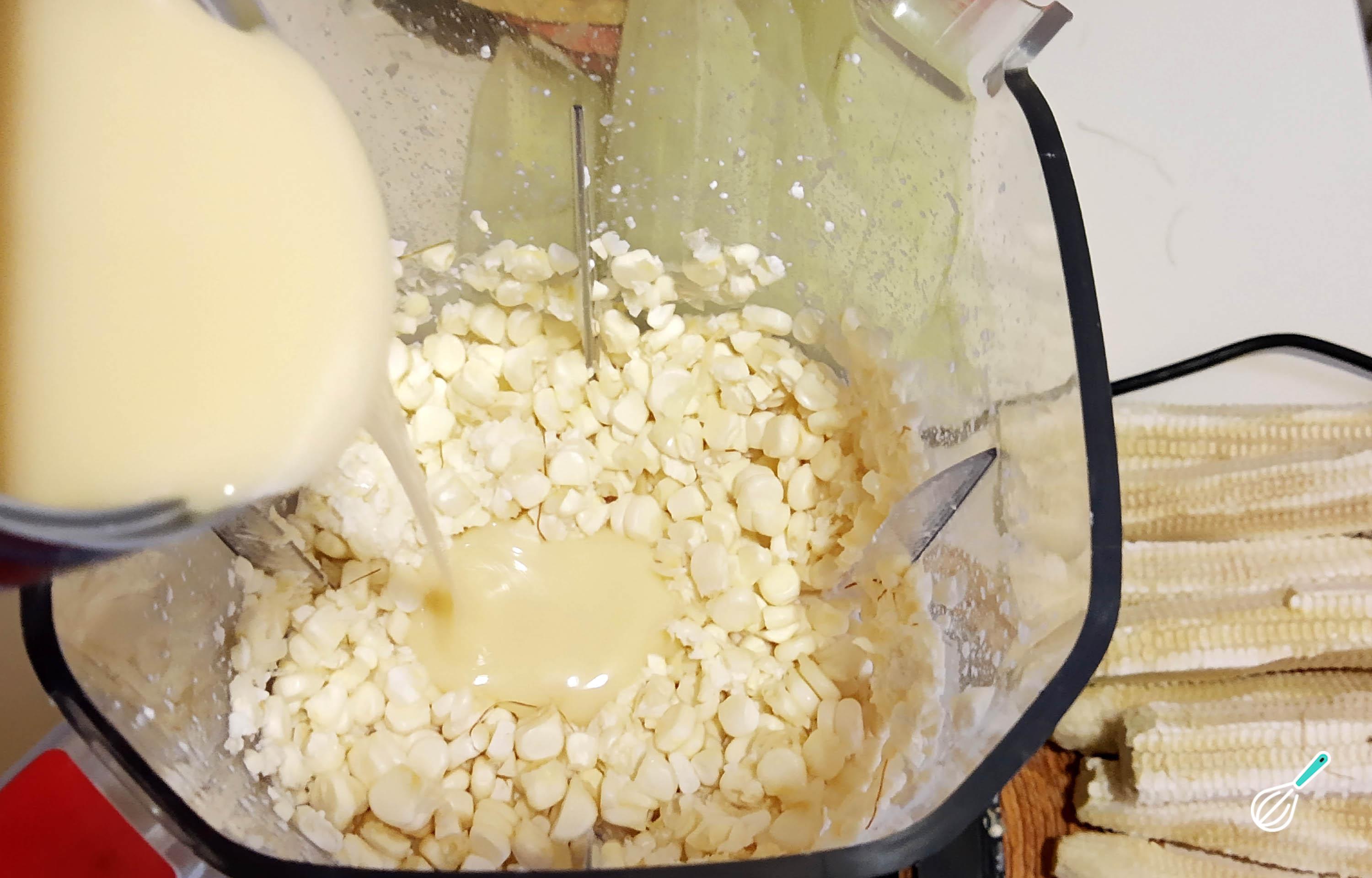 Quando tiver descascado todo o seu milho, coloque os grãos no liquidificador e adicione a pitada de sal e o leite condensado. Bata bem até obter uma massa muito macia, mas firme ao mesmo tempo. Também não tem problema se, nesse momento, a massa ficar doce demais porque ela será cozinhada na água e perderá um pouco dessa doçura.