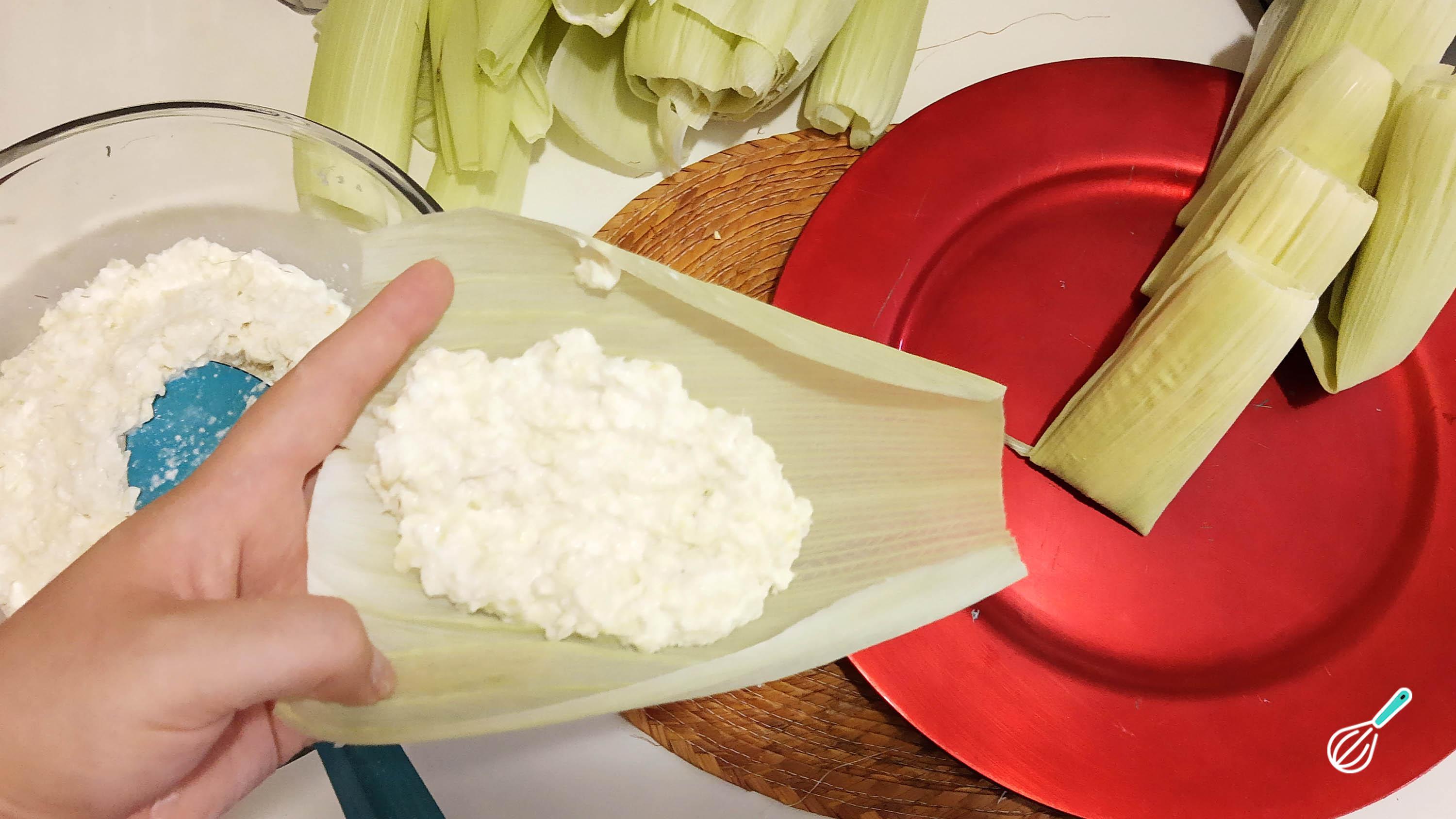 Comece a modelar as pamonhas: pegue uma das palhas do milho e coloque uma porção da massa de milho batida no liquidificador e também uma fatia de queijo minas, se desejar. Dobre a parte de baixo da palha na direção do recheio e dobre as laterais para o meio também, de modo a obter um "copinho".