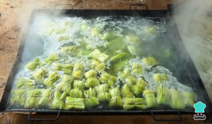 Pegue agora nas palhas das espigas e corte-as em retângulos grandes. Sobreponha duas palhas e, sobre elas, coloque uma porção do preparado anterior; dobre os lados das palhas como se estivesse fazendo um embrulho e amarre bem com uma tirinha de palha ou fio barbante. Repita até esgotar toda a massa de pamonha.