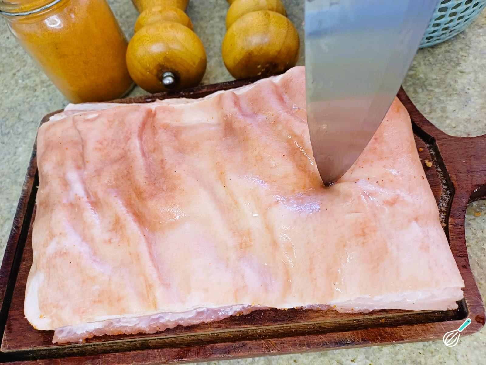 Comece secando a panceta com papel absorvente, dos dois lados. Faça furos com a ponta da faca na pele, para penetrar o tempero e ajudar na hora de pururucar.