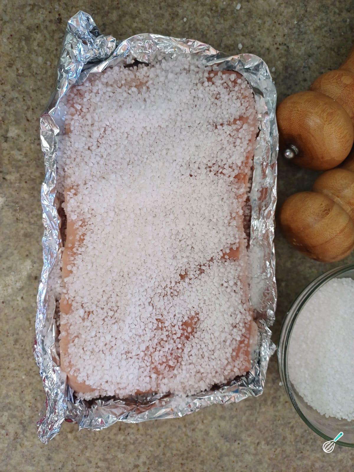 Separe uma folha de papel alumínio e coloque a panceta no meio, com a pele para cima, vá dobrando as pontas até chegar na panceta, formando um pacote, mas deixando a parte de cima exposta. Cubra com bastante sal grosso.