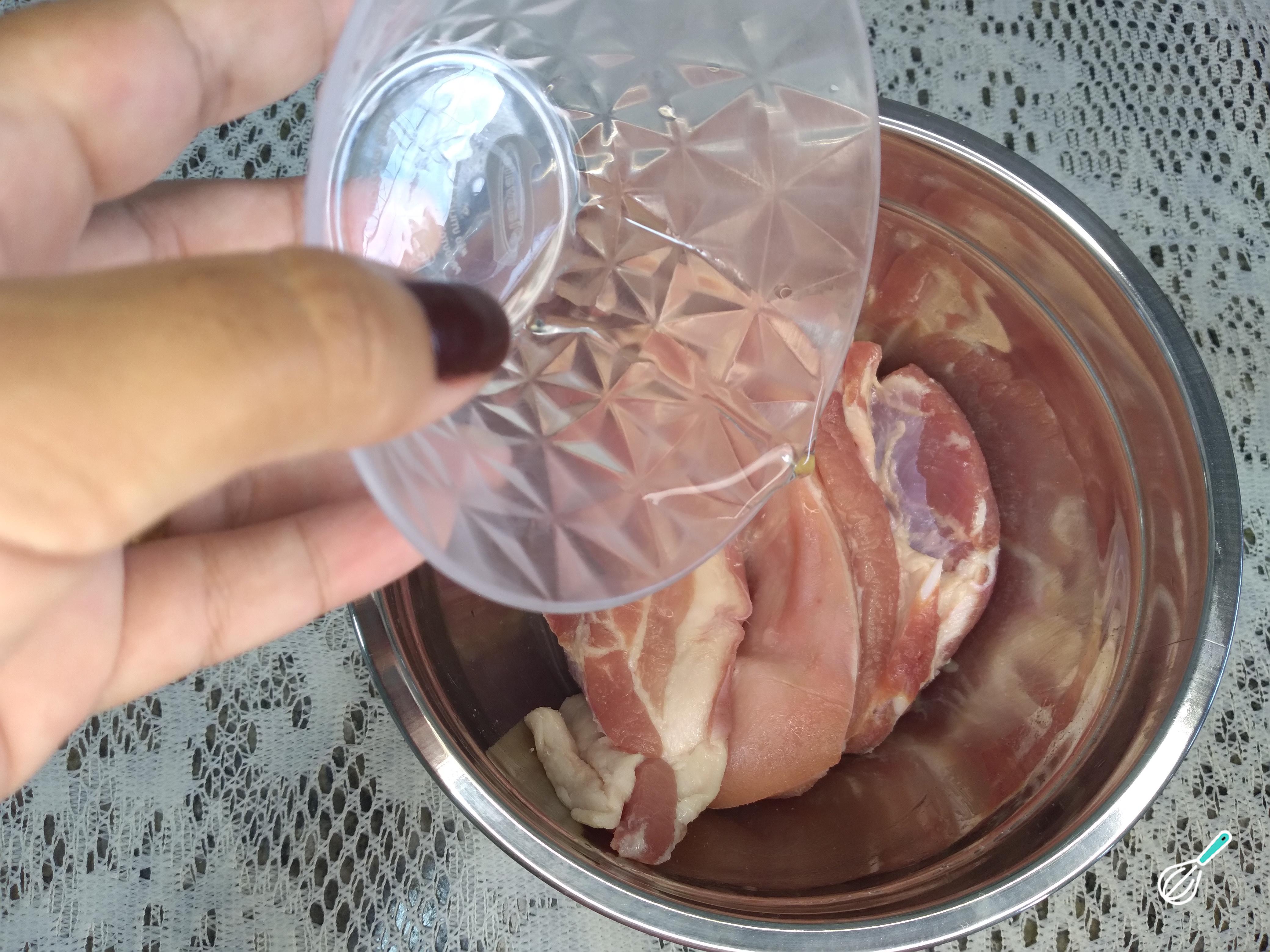 Em um bowl, coloque a panceta suína e acrescente o sal e o vinagre. O vinagre pode ser substituído por um limão espremido. Misture bem o sal e o vinagre à carne. Para que os sabores fiquem bem incorporados.
