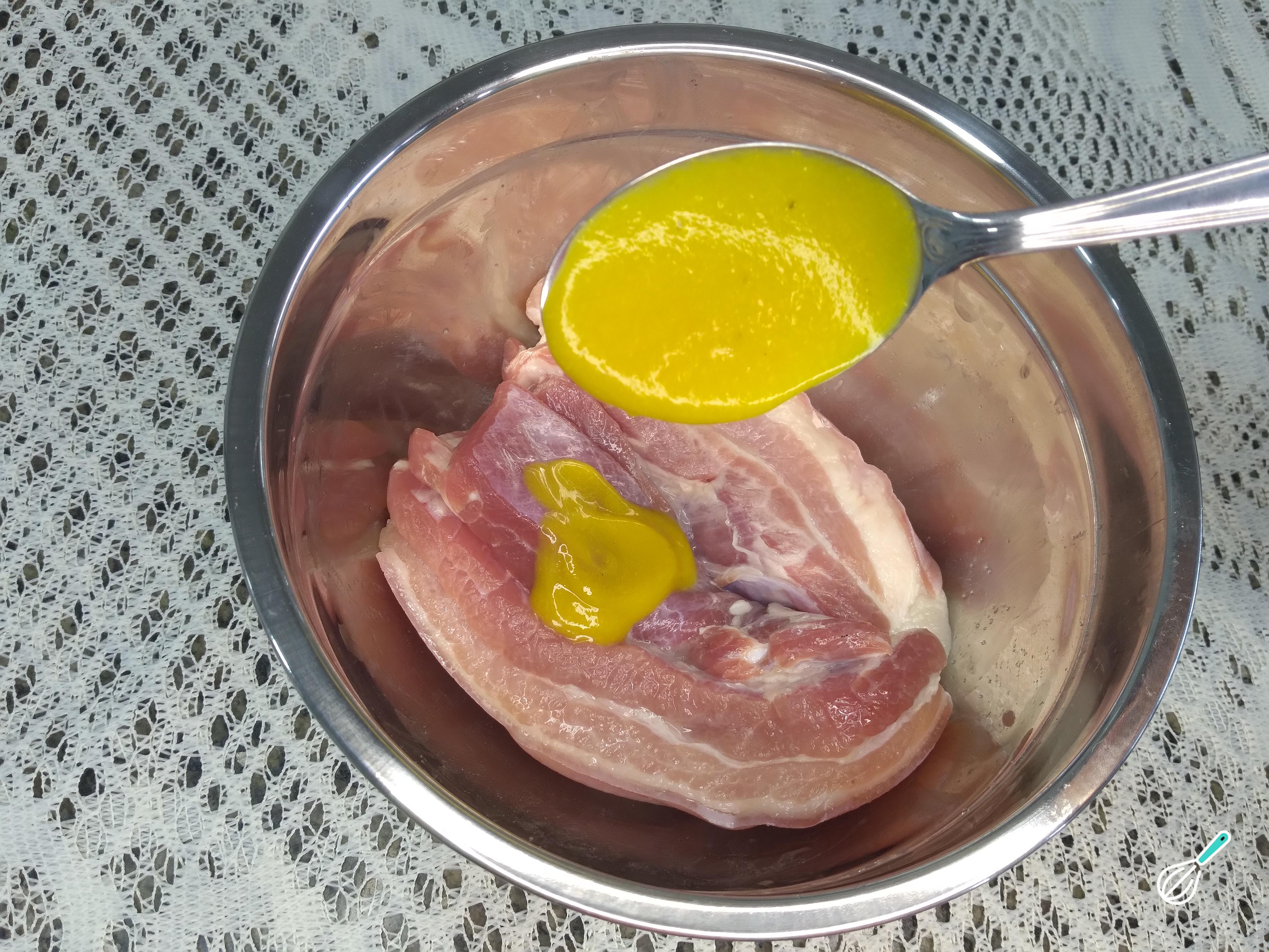 Feito isso, acrescente a mostarda. Usando as mãos, misture muito bem a mostarda à carne, para que incorpore bem o sabor da mostarda.