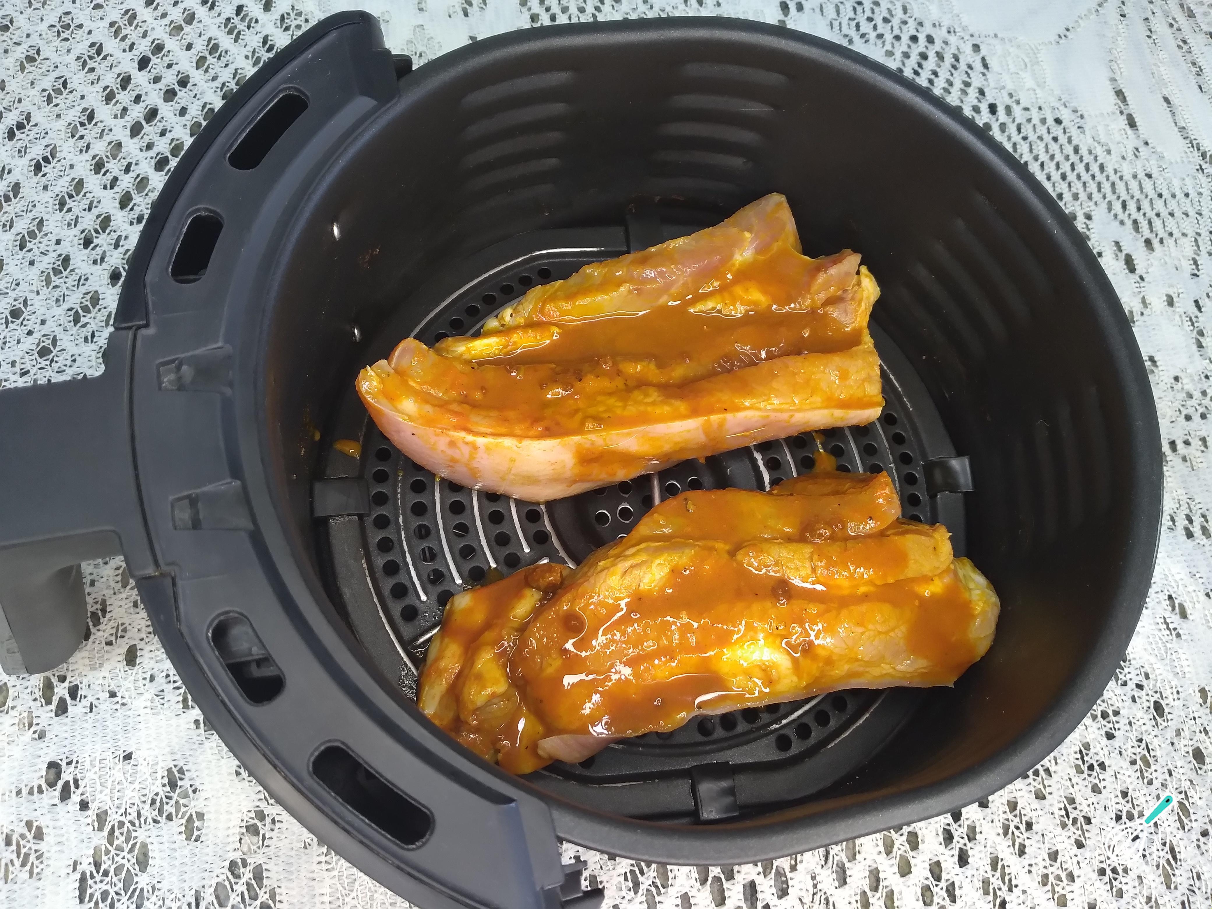 Coloque os pedaços da panceta na air fryer, despeje o caldo da vasilha por cima da carne.