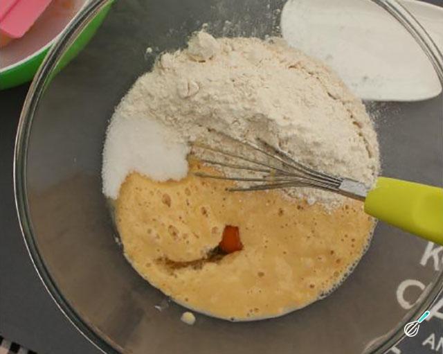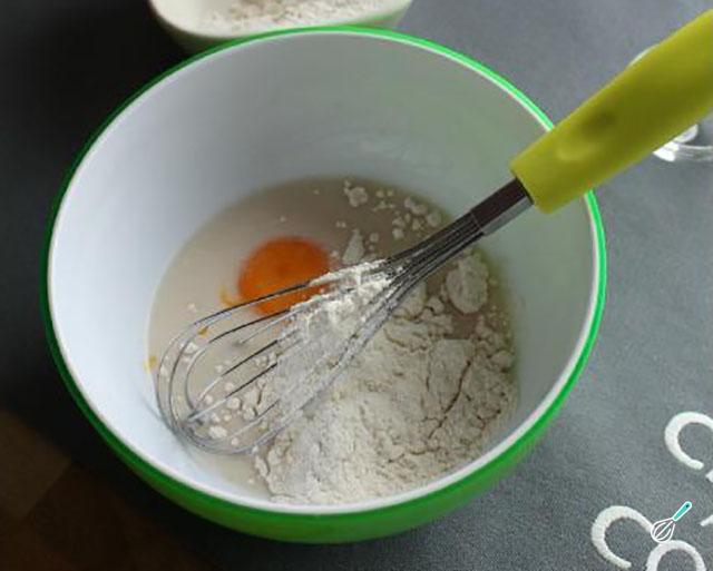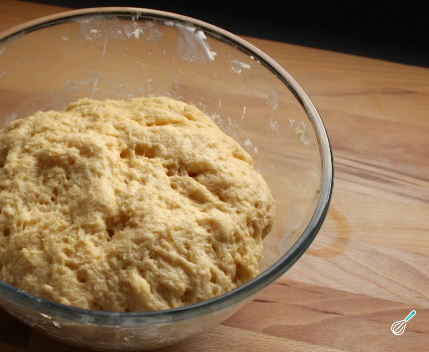 Passado o tempo de fermentação que mencionamos anteriormente, faça a primeira massa do pandoro. Em um recipiente maior dissolva o fermento com água, adicione o lievitino, a farinha, o ovo, o açúcar e bata energicamente com a ajuda de um batedor manual (fouet).