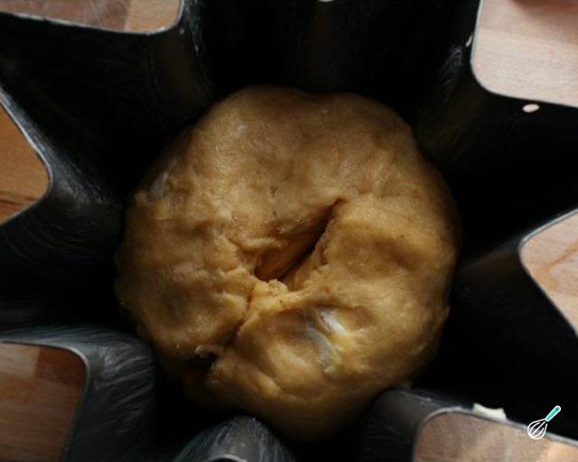 Para continuar a receita do pandoro, coloque a massa sobre a mesa em que você pretende trabalhar, amasse e dobre a massa sobre si mesma. Coloque em um recipiente untado com manteiga, cubra com um pano limpo e deixe por 60-90 minutos ou até que dobre o tamanho.