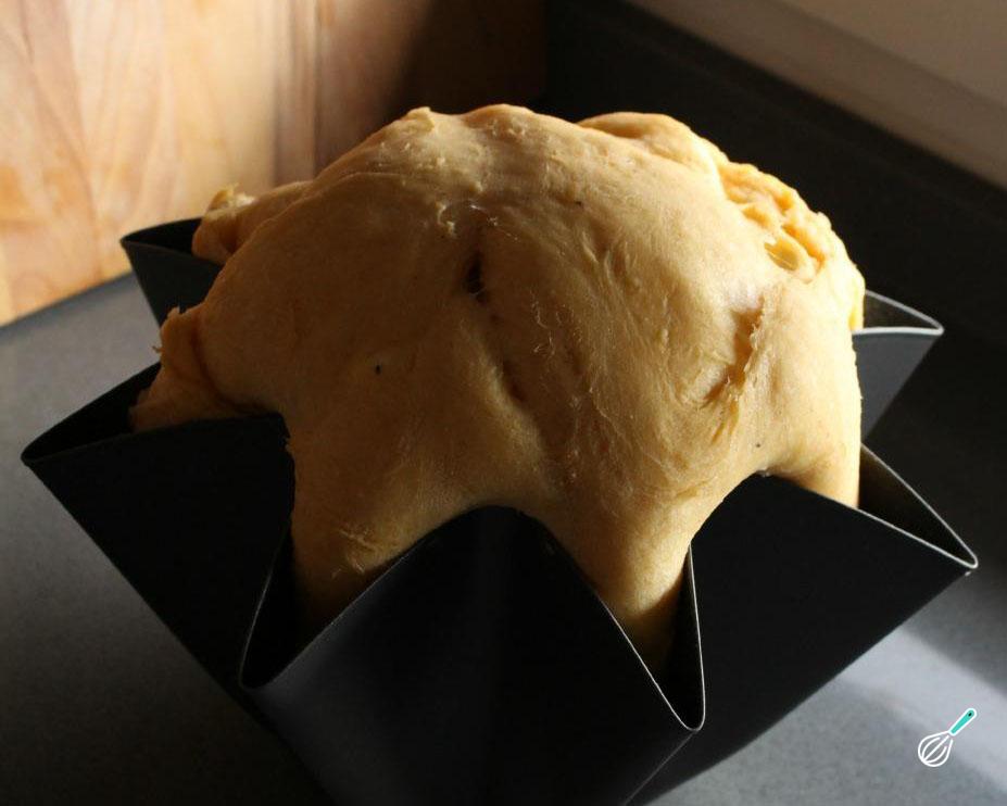 Tampe a massa com um pano limpo e, mais uma vez, deixe repousar até que dobre o tamanho. Quando o Pandoro italiano crescer fora da assadeira, como na foto, pré-aqueça o forno a 170ºC.