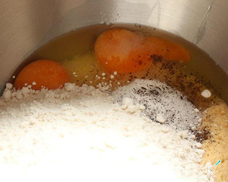 Passado o tempo indicado, você já pode preparar a segunda massa do Pandoro italiano. Nesse momento você vai utilizar a batedeira. Adicione a primeira massa, os ovos, a farinha, o açúcar, sal e baunilha. Misture e amasse durante 8-10 minutos.