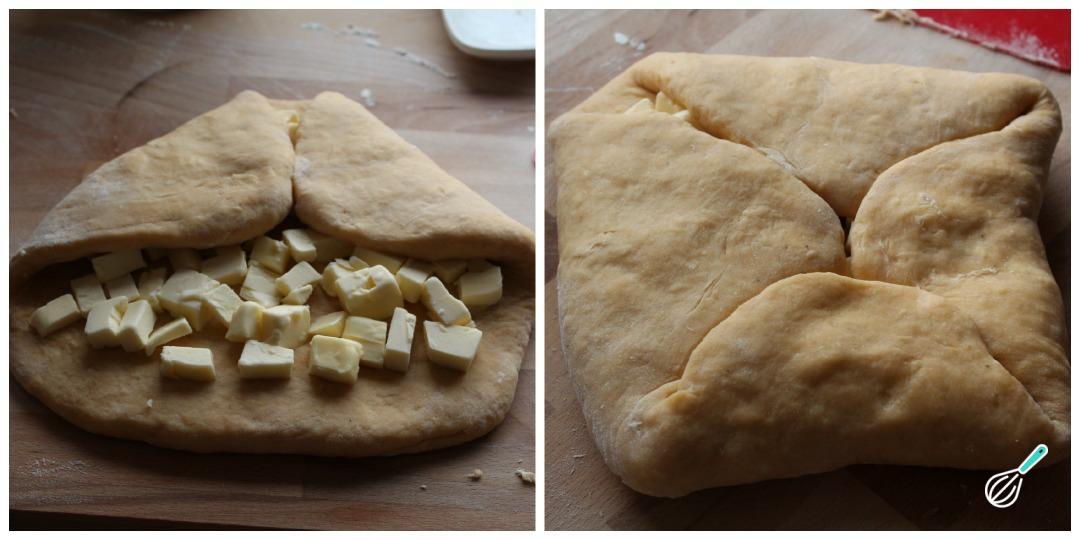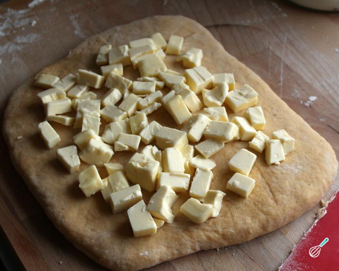 Quando estiver com o dobro do tamanho, coloque a massa na geladeira e deixe por 30-40 minutos. Volte a colocar a massa na mesa que você pretende trabalhar, abra com um rolo e dê uma forma quadrada. Coloque sobre a massa alguns pedaços de manteiga.